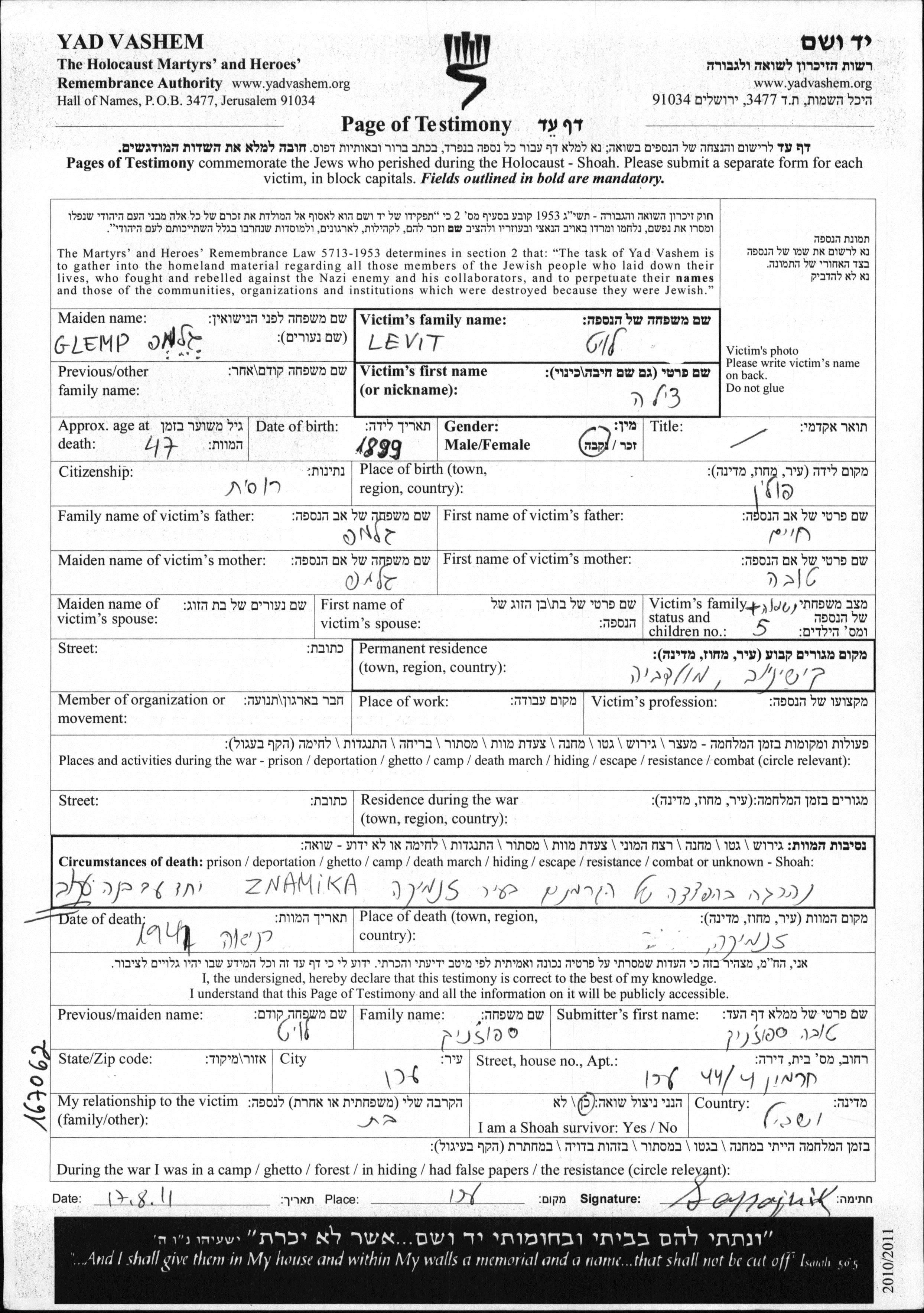 Tzila Levit nee Glemp was born in Poland, 1899 to Khaim and Tuba. She was married. Prior to WWII she lived in Kishinev, Romania. Tzila was murdered in the Shoah. Place of death: Znamenka, Ukraine (USSR), 1941.