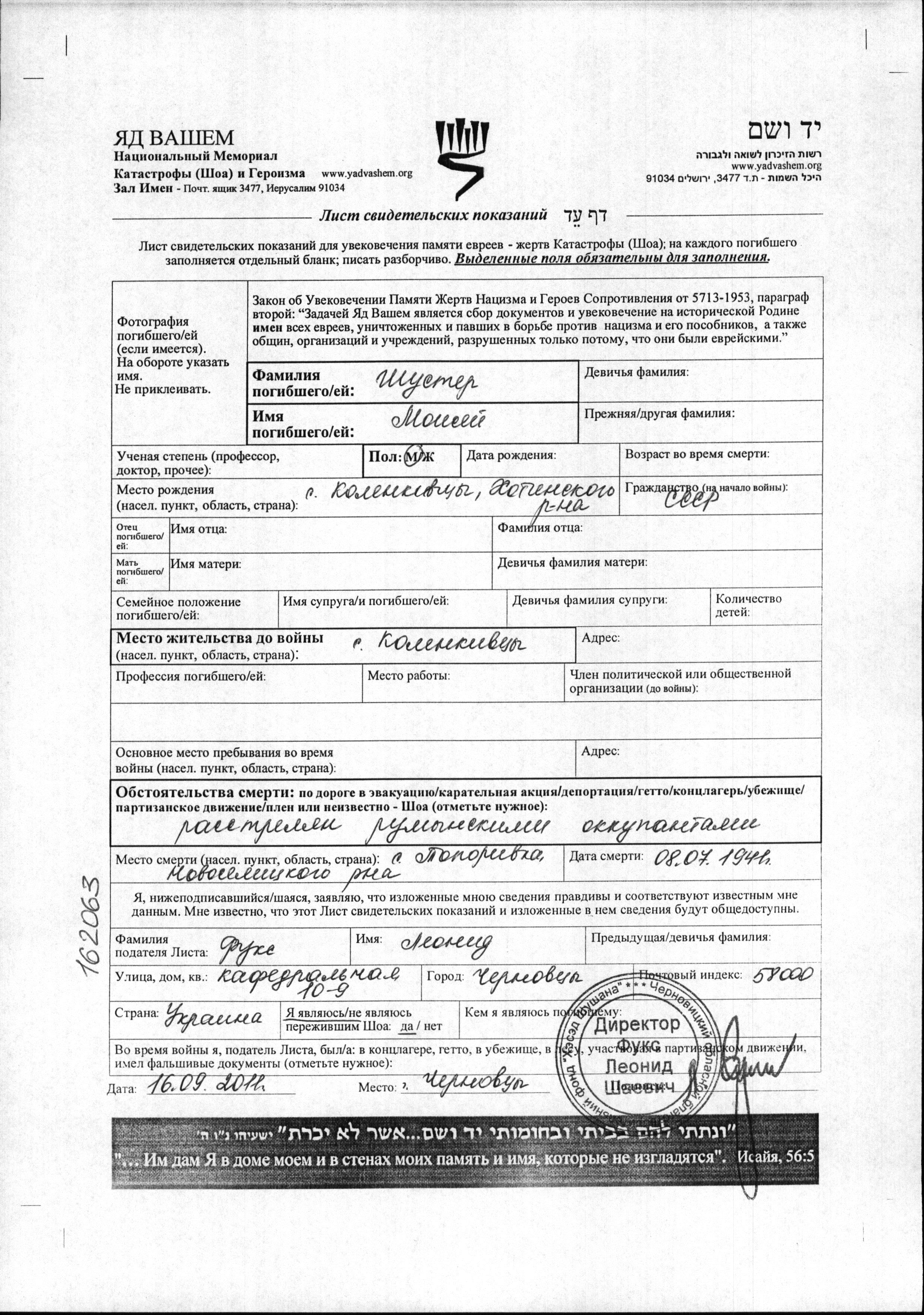 Moisey was murdered in the Shoah. Place of death: Toporivka, Romania, 08/07/1941.