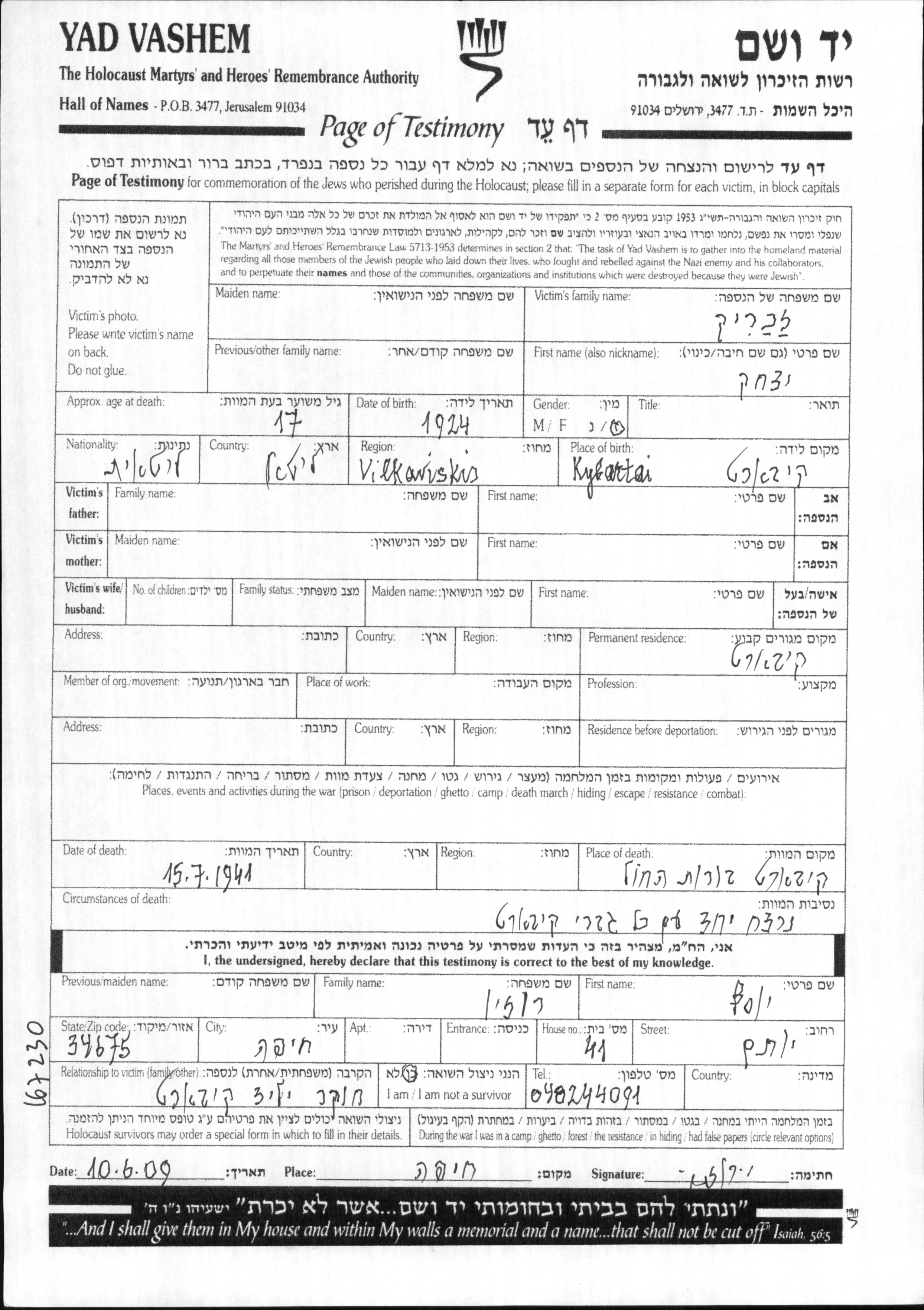זכריק Yitzkhak 1924 Kybartai, Lithuania Page of Testimony