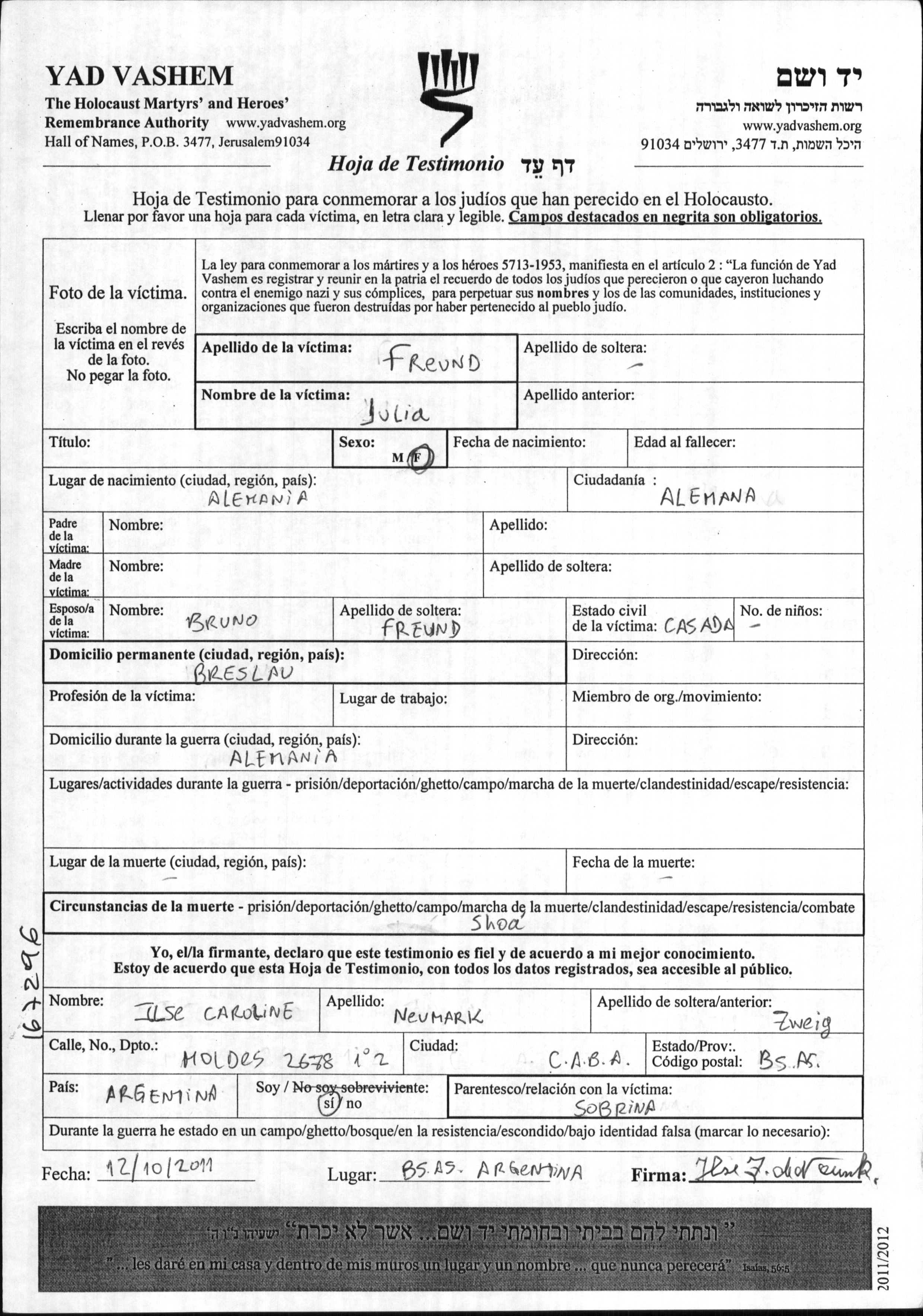 Freund Julia Breslau, Germany Page of Testimony