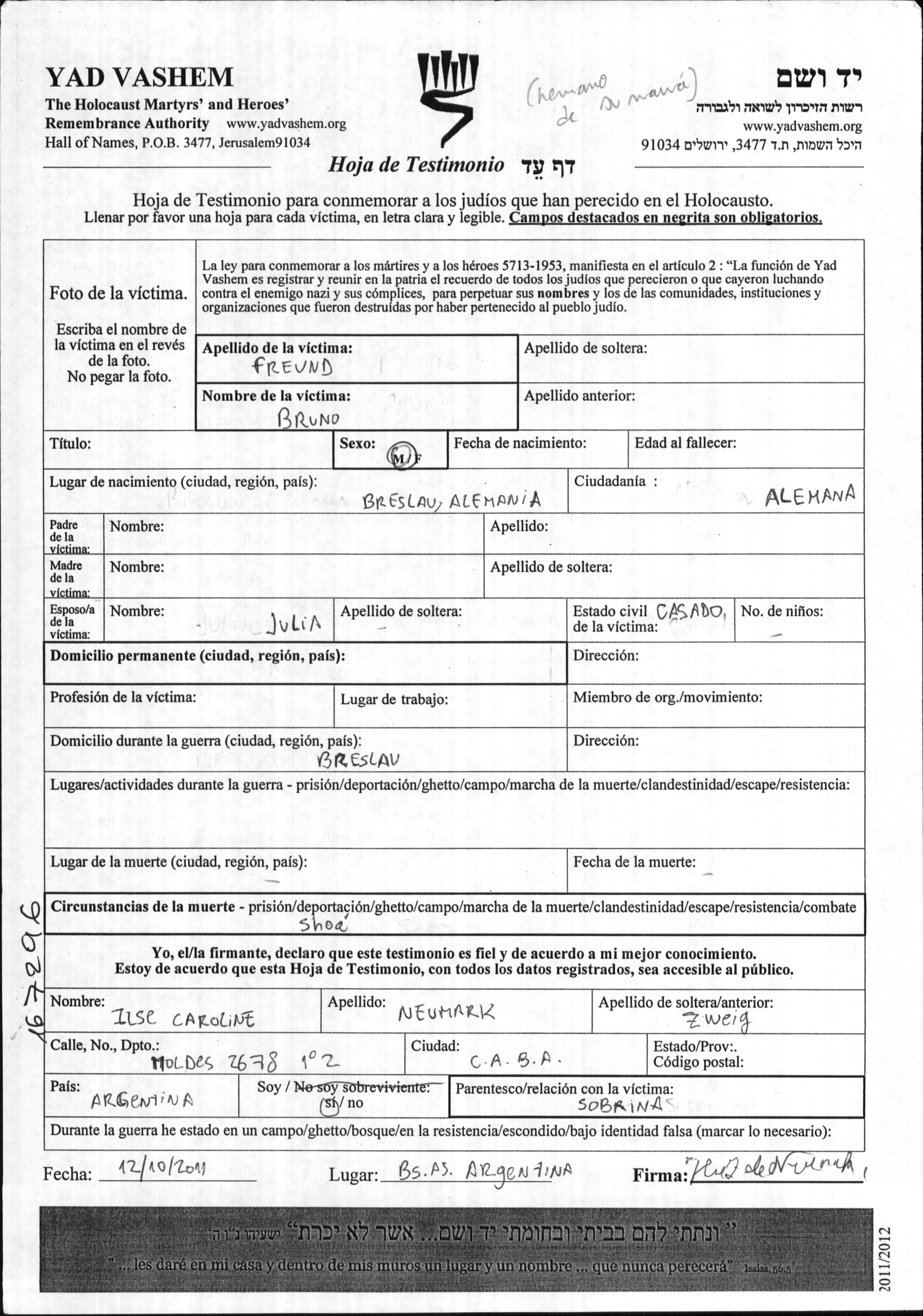 Bruno Freund was born in Breslau, Germany. He was married to Julia. Prior to WWII he lived in Breslau, Germany.