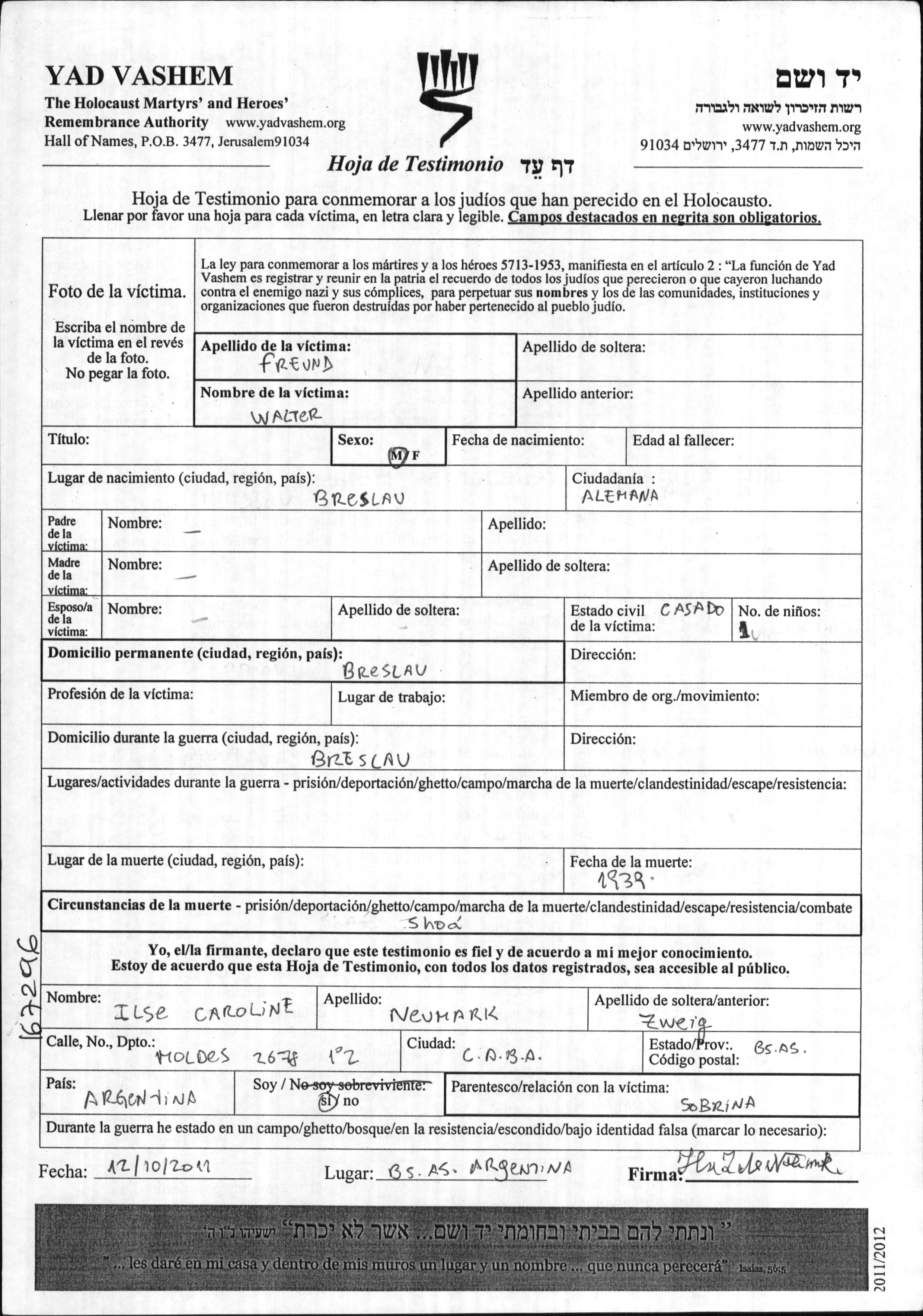 Walter Freund was born in Breslau, Germany. He was married. Prior to WWII he lived in Breslau, Germany. During the war he was in Breslau, Germany.