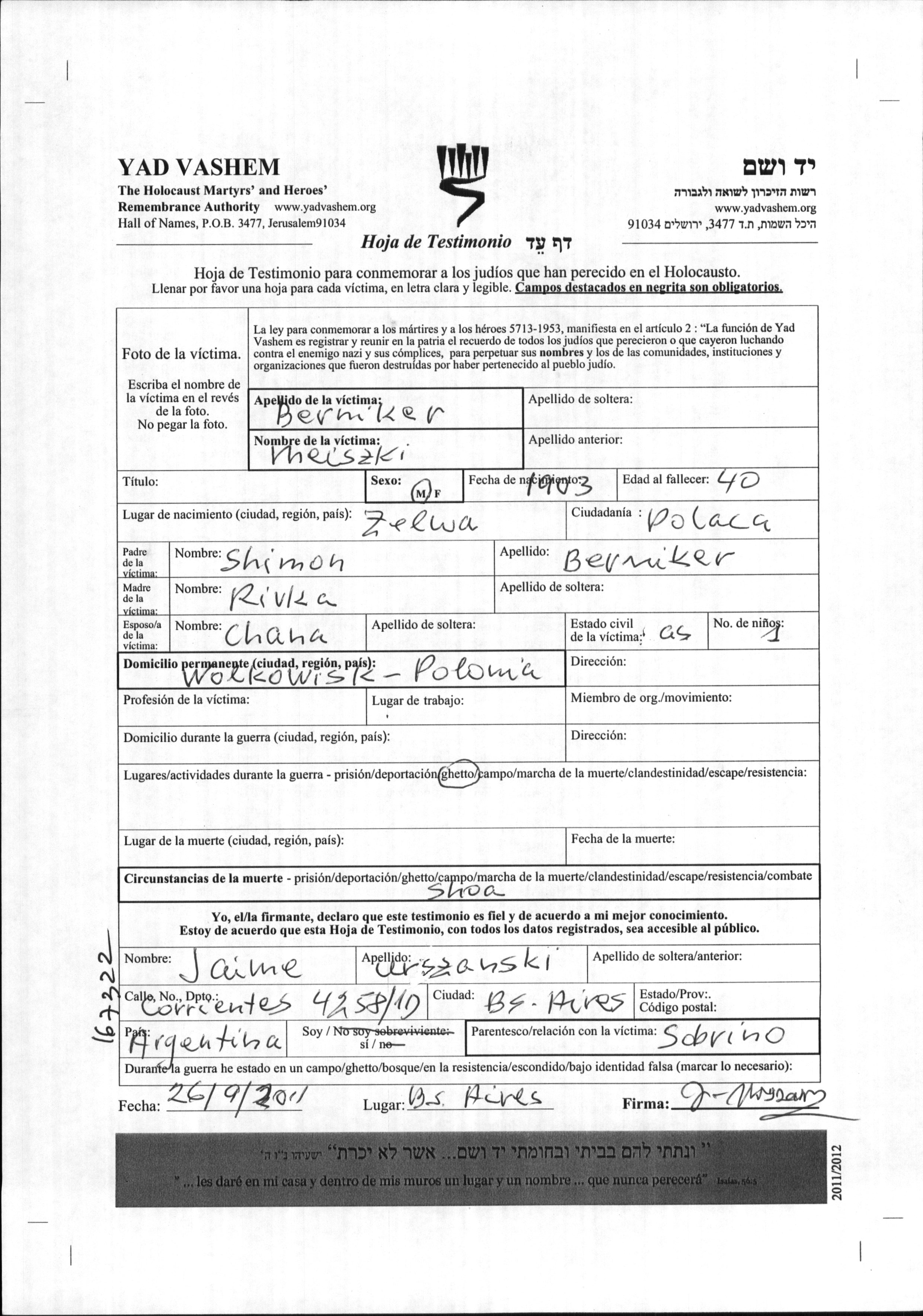 Berniker Meiszki 1903 Wolkowisk, Poland Page of Testimony