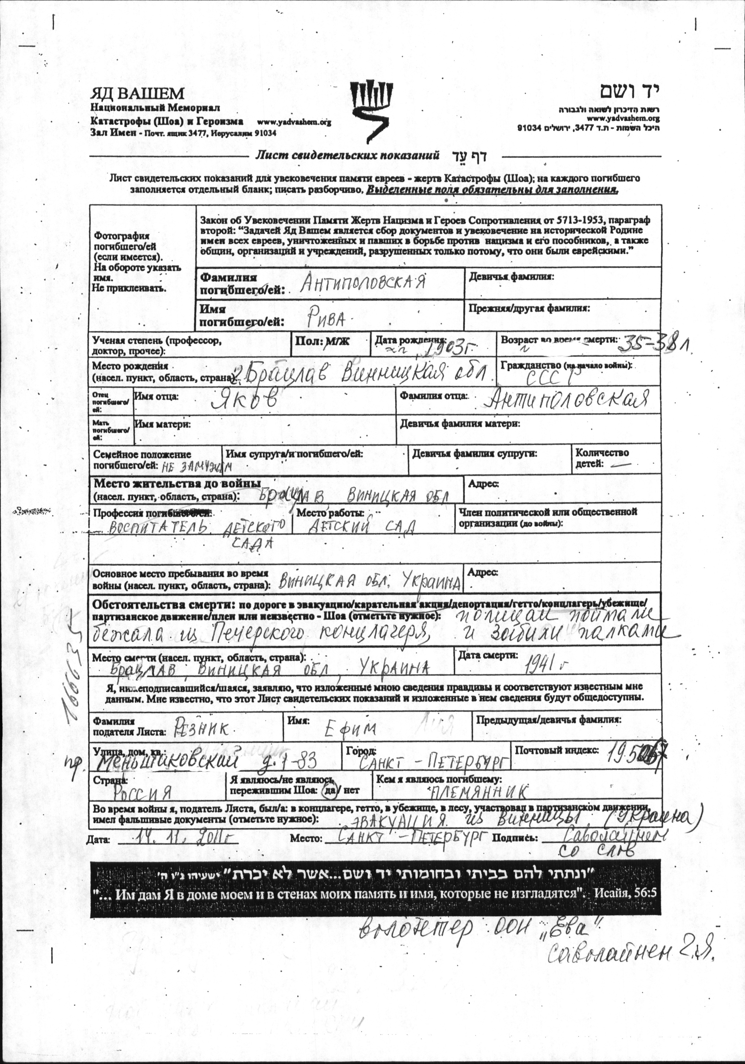 Riva Antipolovskaya was born in Bratslav, Ukraine (USSR), 1903 to Yakov. She was a nursery school teacher and single. Prior to WWII she lived in Bratslav, Ukraine (USSR). During the war she was in Pechera, Ukraine (USSR). Riva was murdered in the Shoah. Place of death: Bratslav, Ukraine (USSR), 1941.