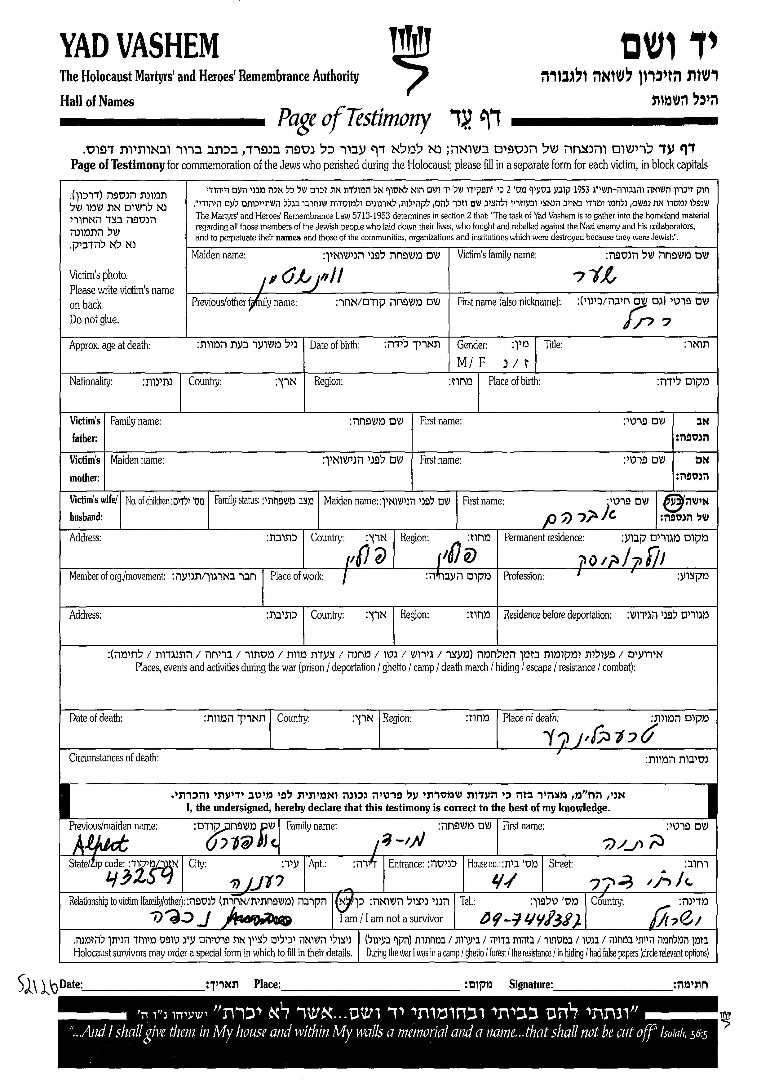 Yad Vashem - Pages of Testimony Names Memorial Collection