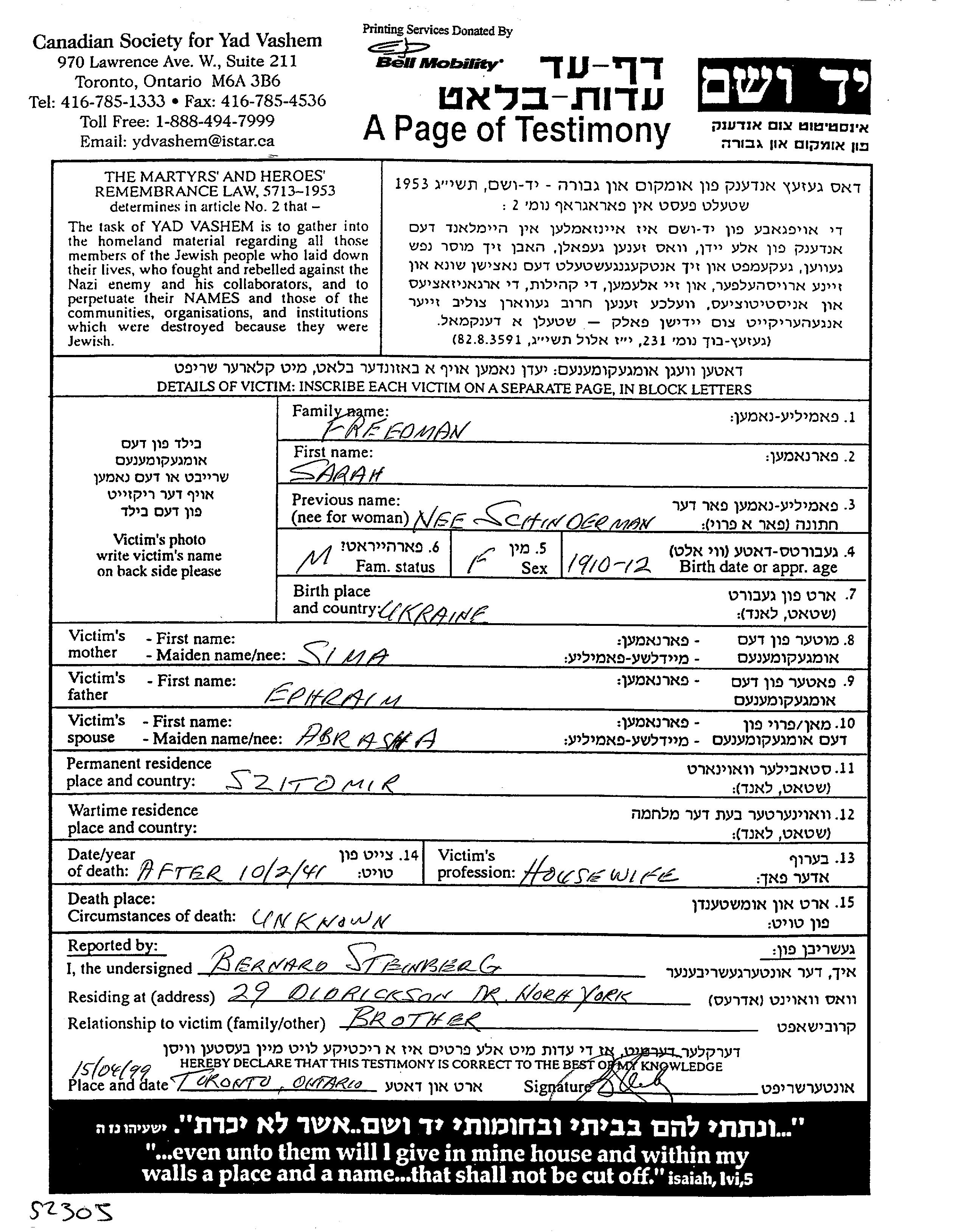 Freedman Sarah 1910 Zitomir, Ukraine (USSR) Page of Testimony