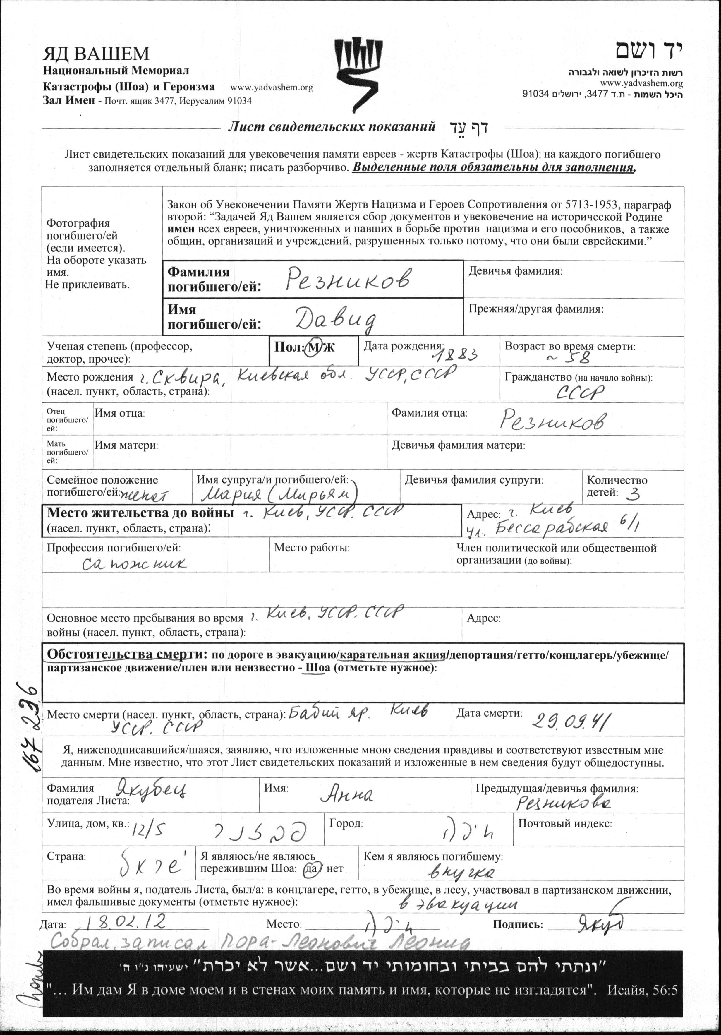 Reznikov David 1883 Kiev, Ukraine (USSR) Page of Testimony