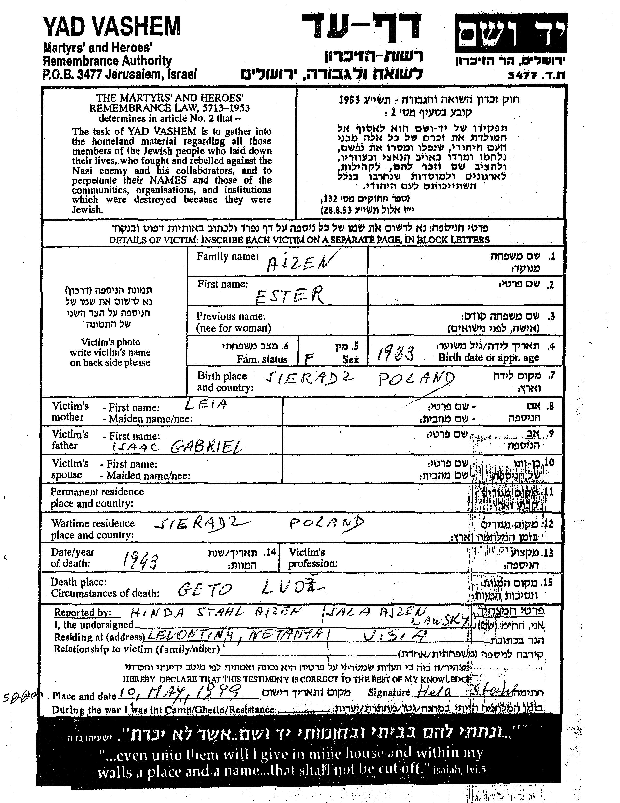 Ester Aizen was born in Sieradz, Poland, 1923 to Isaac Gabriel and Leia. During the war she was in Sieradz, Poland.