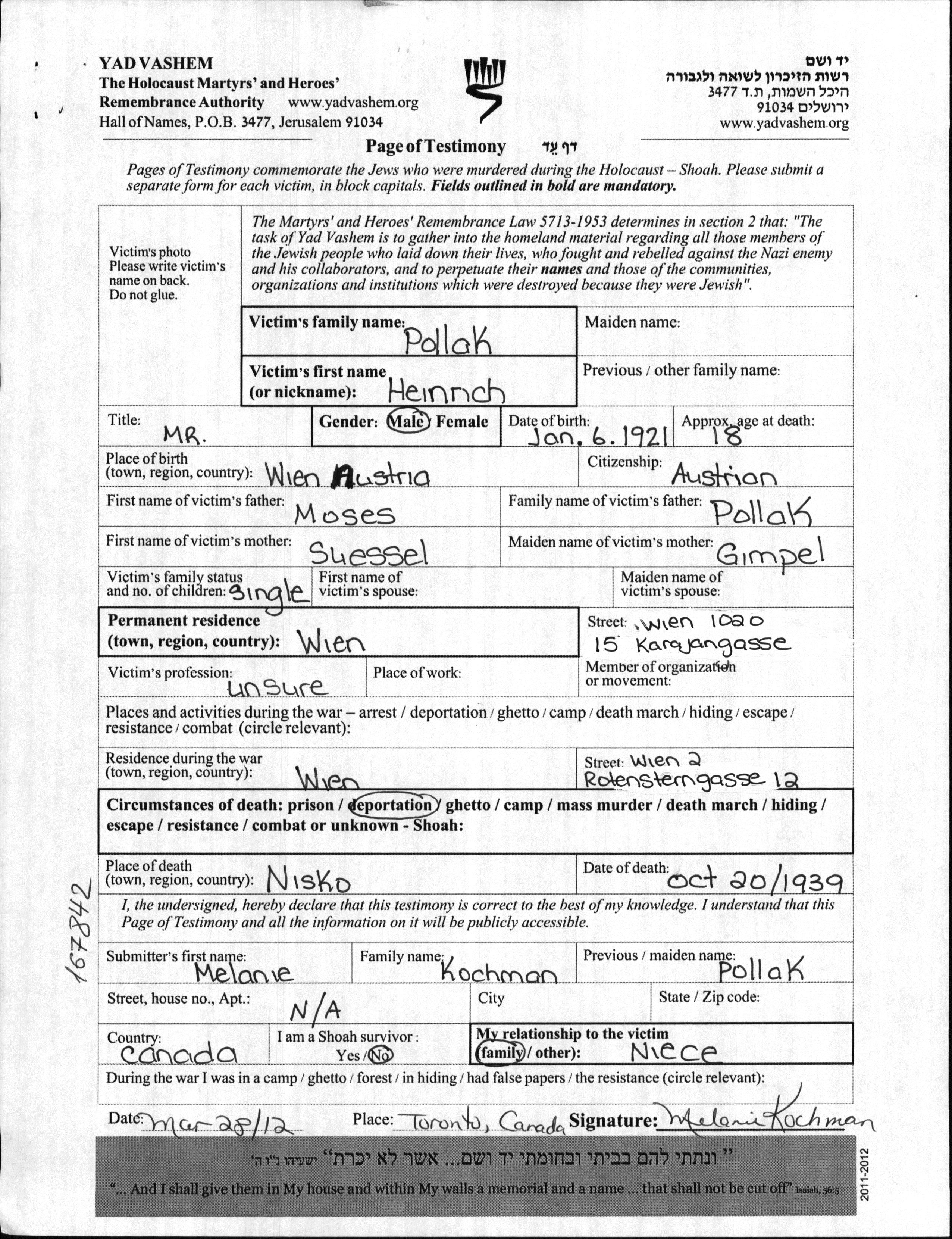 Heinch Pollak was born in Wien, Austria, 1921 to Moses and Suessel nee Gimpel. He was single. Prior to WWII he lived in Wien, Austria. During the war he was in Wien, Austria. Heinch was murdered in the Shoah. Place of death: Nisko, Poland, 20/10/1939.