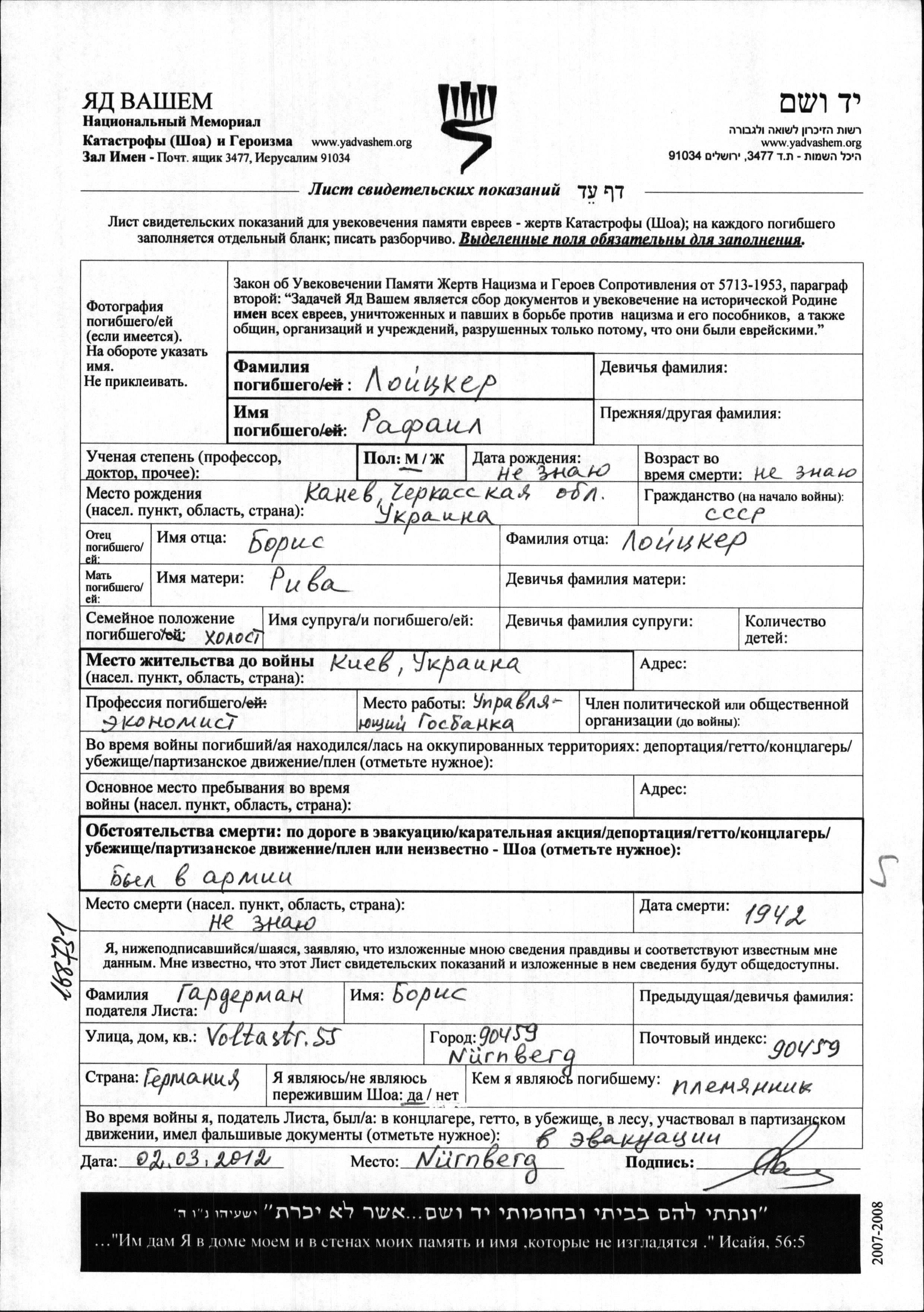 Loytzker Rafail Kiev, Ukraine (USSR) Page of Testimony