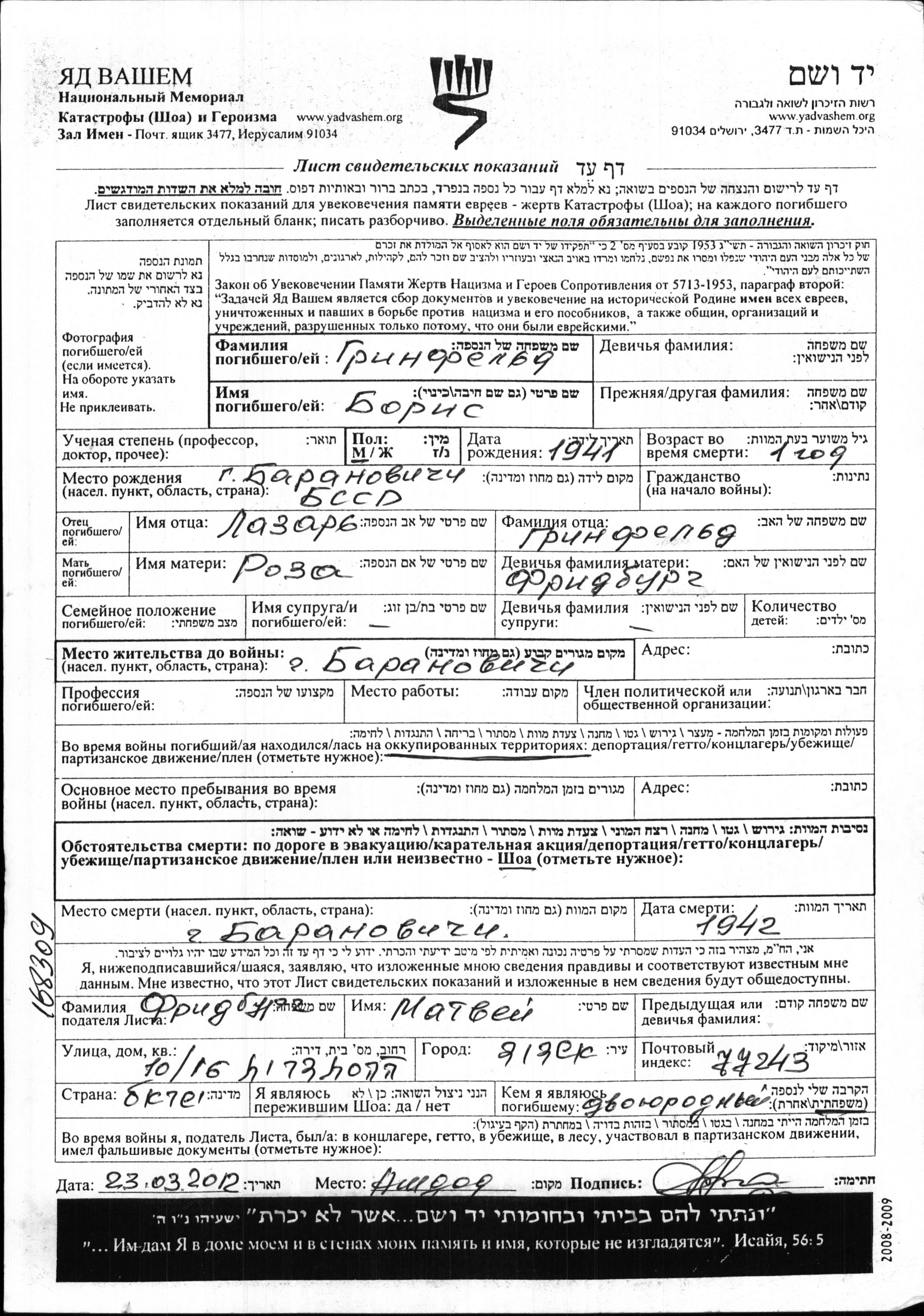 Grinfeld Boris 1941 Baranovichi, Poland Page of Testimony