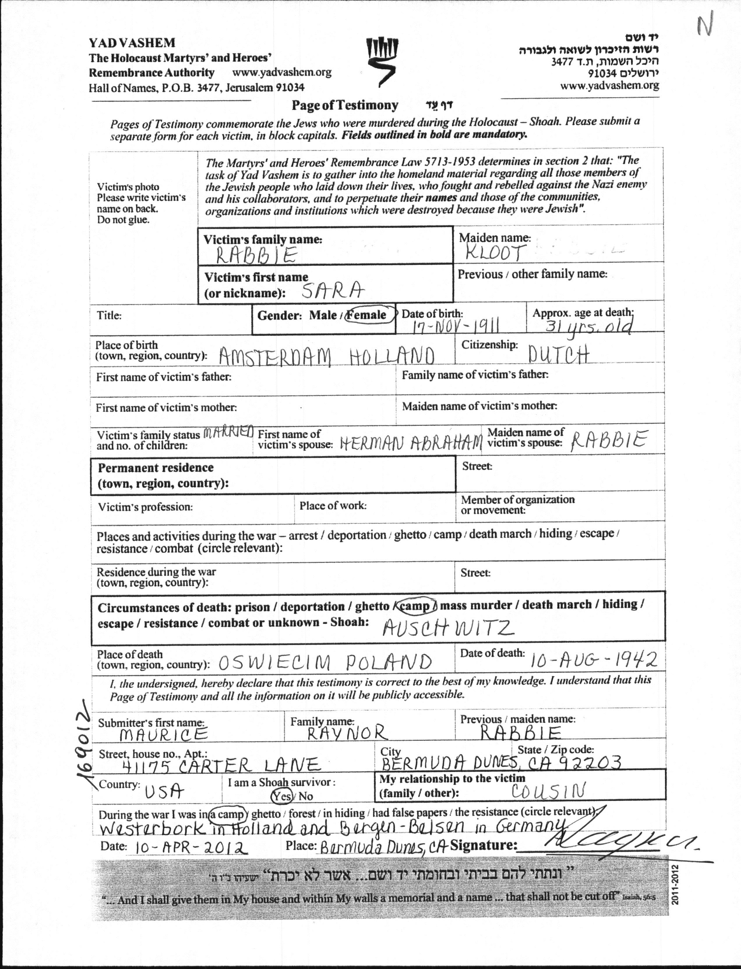 Sara Rabbie nee Kloot was born in Amsterdam, The Netherlands, 1911. She was married to Herman Abraham.