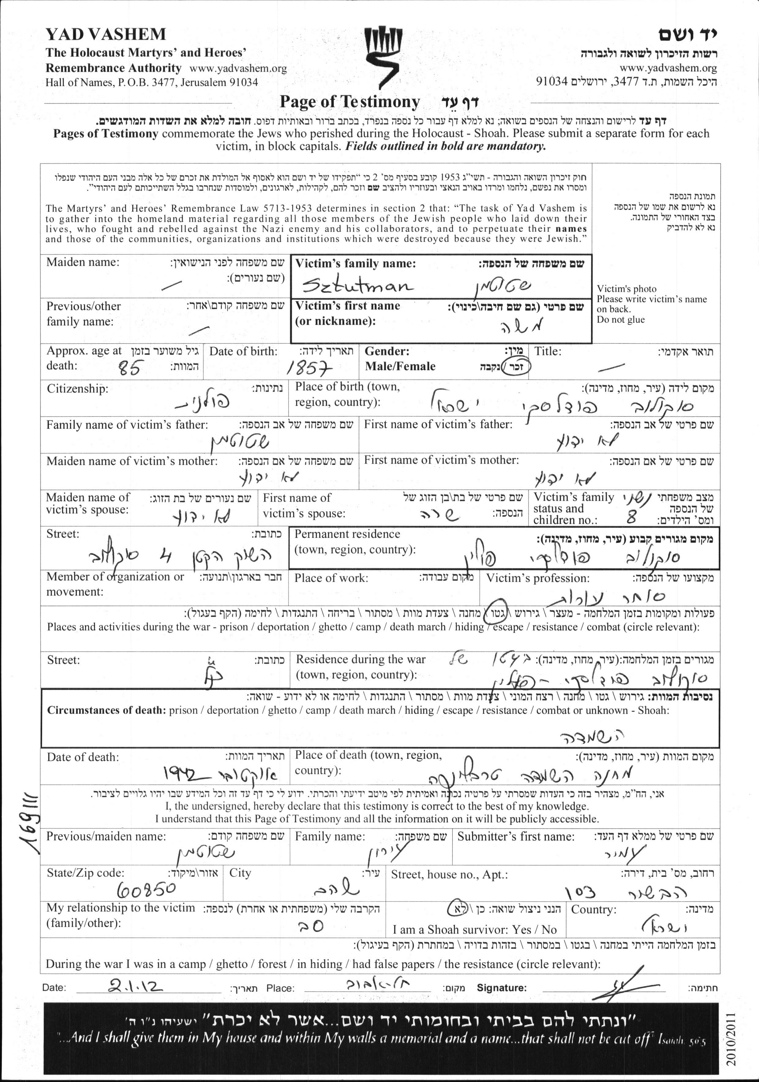 Moshe Sztutman was born in Sokolow Podlaski, Poland, 1857. He was a leather merchant and married to Sara. Prior to WWII he lived in Sokolow Podlaski, Poland. During the war he was in Sokolow Podlaski, Poland. Moshe was murdered in the Shoah. Place of death: Treblinka, Poland, 10/1942.