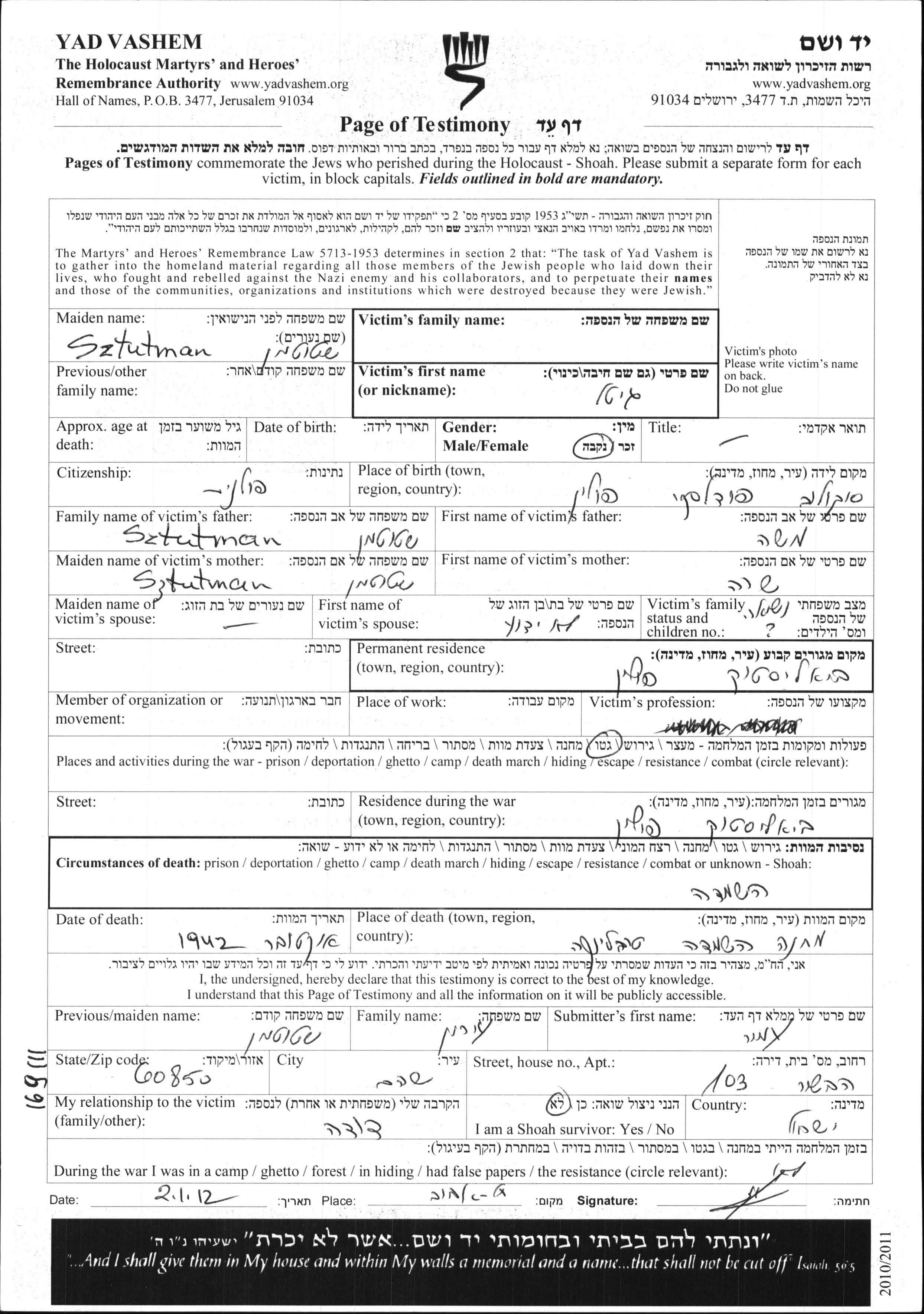 Gitel Surname unknown nee Sztutman was born in Sokolow Podlaski, Poland to Moshe and Sara. She was married. Prior to WWII she lived in Bialystok, Poland. During the war she was in Bialystok, Poland. Gitel was murdered in the Shoah. Place of death: Treblinka, Poland, 10/1942.