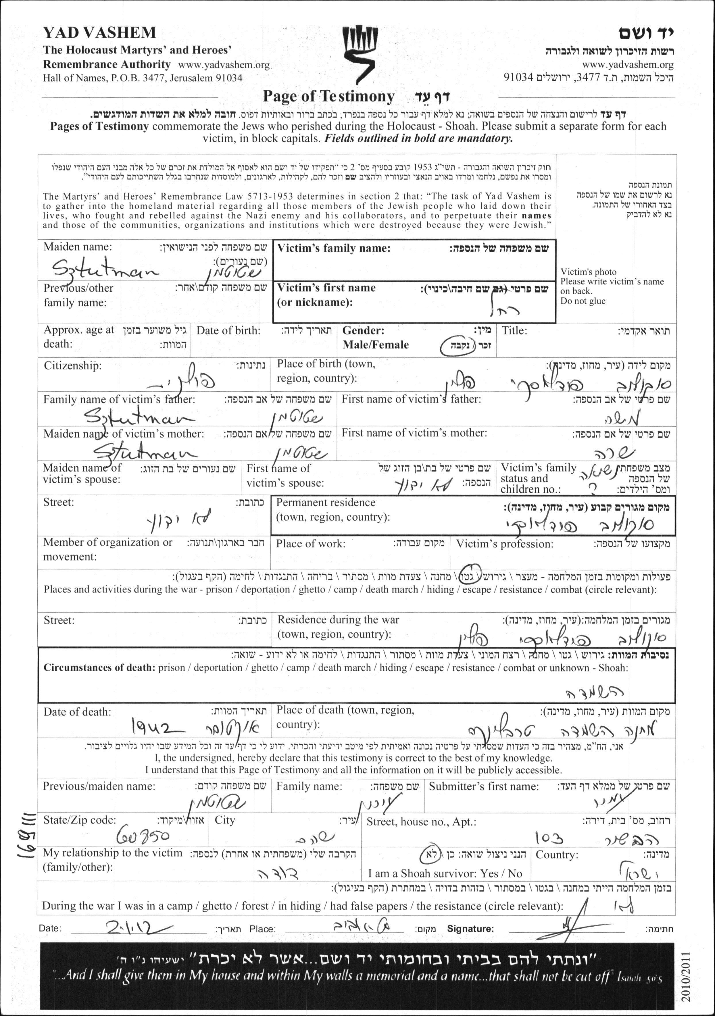Rakhel Surname unknown nee Sztutman was born in Sokolow Podlaski, Poland to Moshe and Sara. She was married. Prior to WWII she lived in Sokolow Podlaski, Poland. During the war she was in Sokolow Podlaski, Poland. Rakhel was murdered in the Shoah. Place of death: Treblinka, Poland, 10/1942.