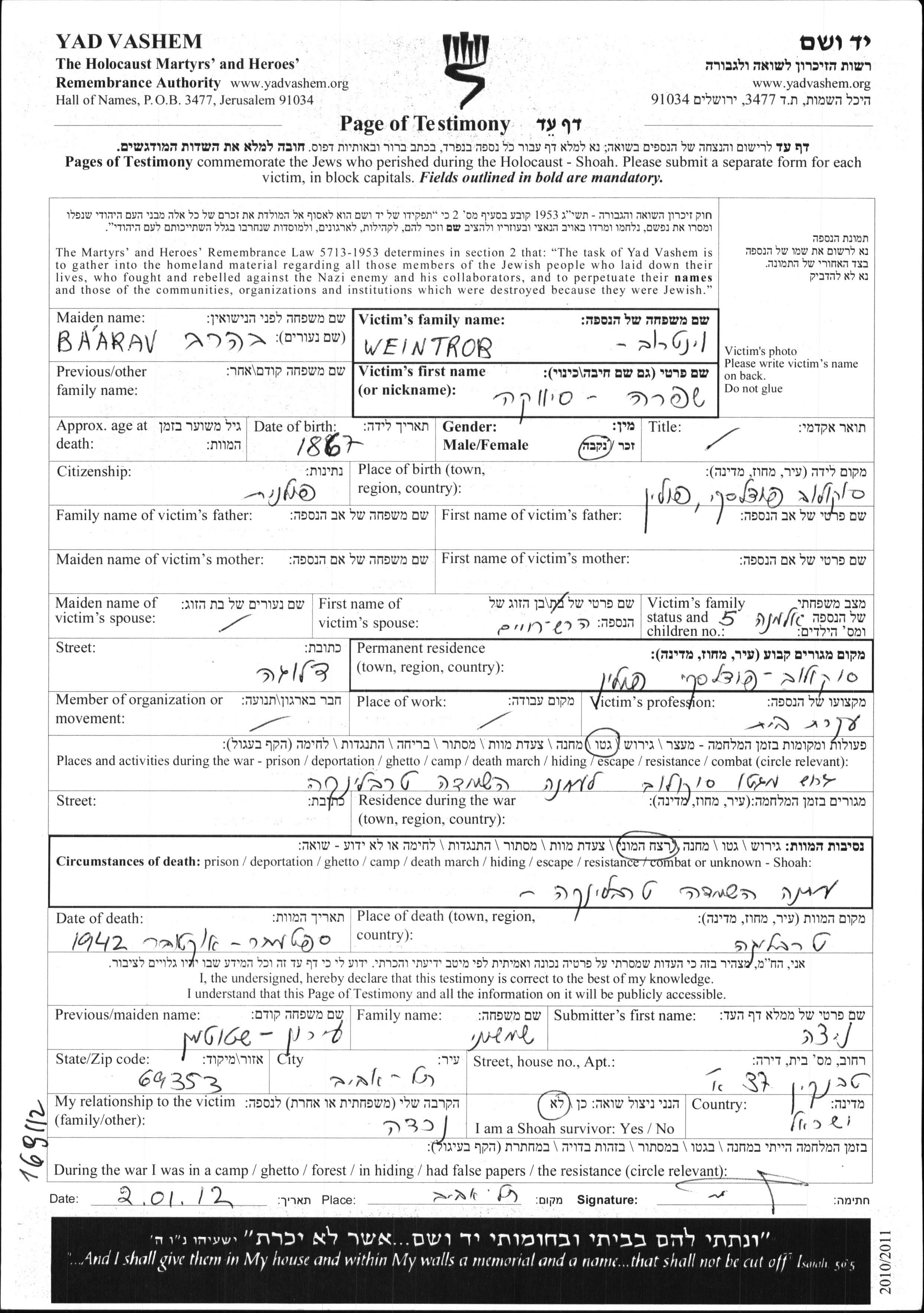 Shifra Siwka Weintrob nee Baarav was born in Sokolow Podlaski, Poland, 1867. She was a housewife and a widow of Hersh Chaim. Prior to WWII she lived in Sokolow Podlaski, Poland. During the war she was in Sokolow Podlaski, Poland. Shifra Siwka was murdered in the Shoah. Place of death: Treblinka, Poland, 10/1942.