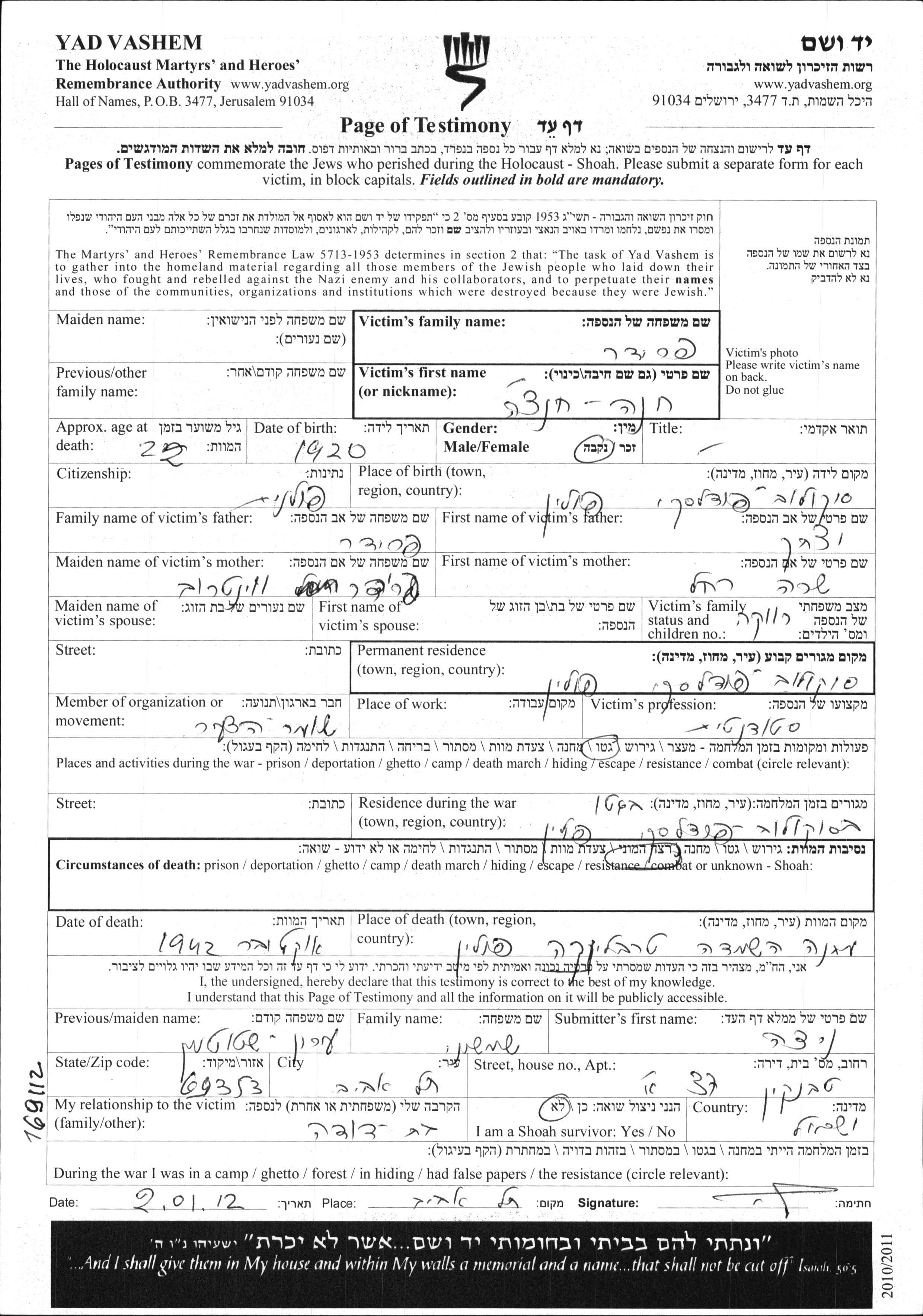 Chana Frider was born in Sokolow Podlaski, Poland, 1920 to Yitzkhak and Sara Rachel nee Veintraub. She was a student and single. Prior to WWII she lived in Sokolow Podlaski, Poland. During the war she was in Sokolow Podlaski, Poland. Chana was murdered in the Shoah. Place of death: Treblinka, Poland, 10/1942.