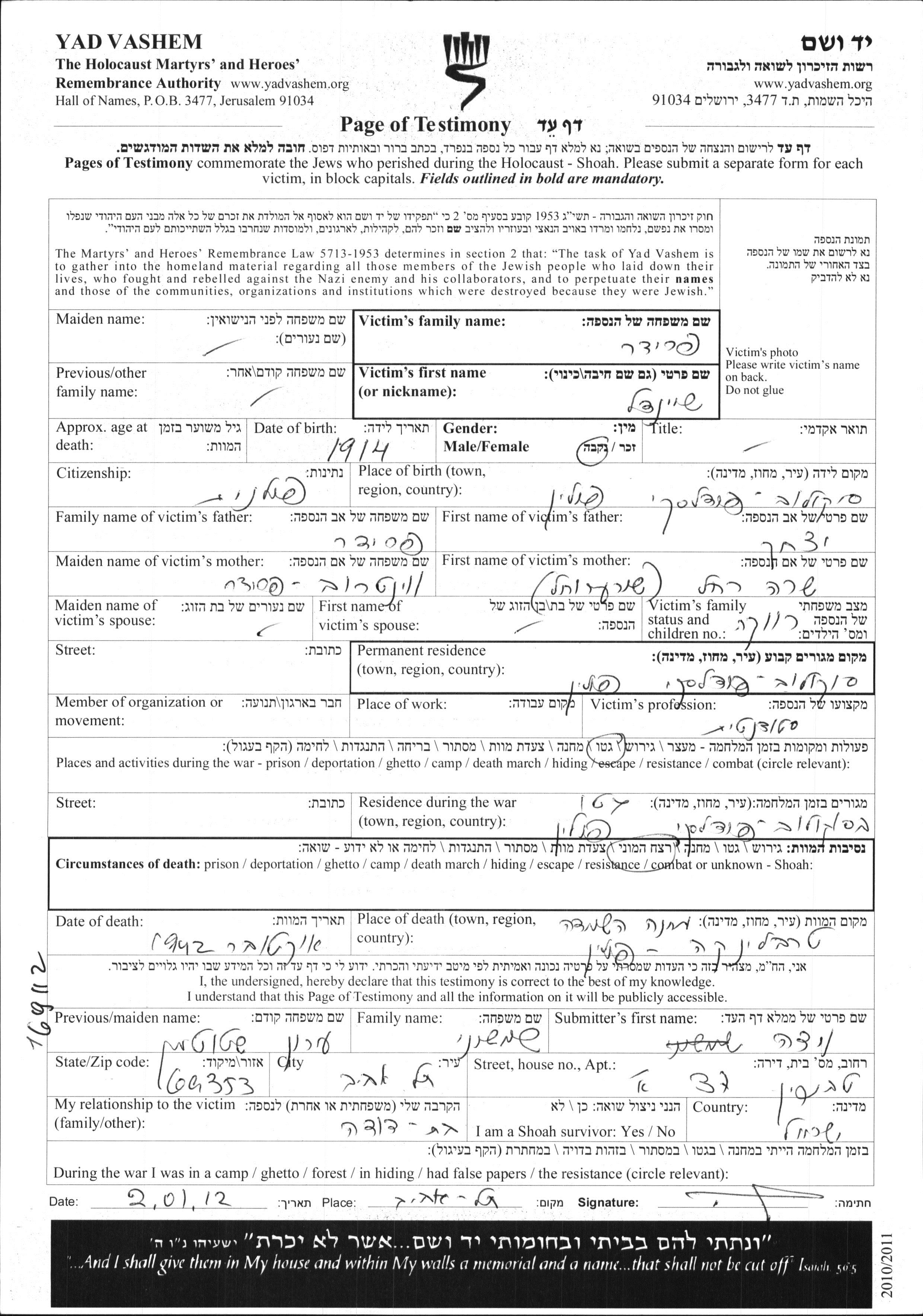Sheindl Frider was born in Sokolow Podlaski, Poland, 1914 to Yitzkhak and Sara Rakhel nee Veintraub. She was a student and single. Prior to WWII she lived in Sokolow Podlaski, Poland. During the war she was in Sokolow Podlaski, Poland. Sheindl was murdered in the Shoah. Place of death: Treblinka, Poland, 10/1942.
