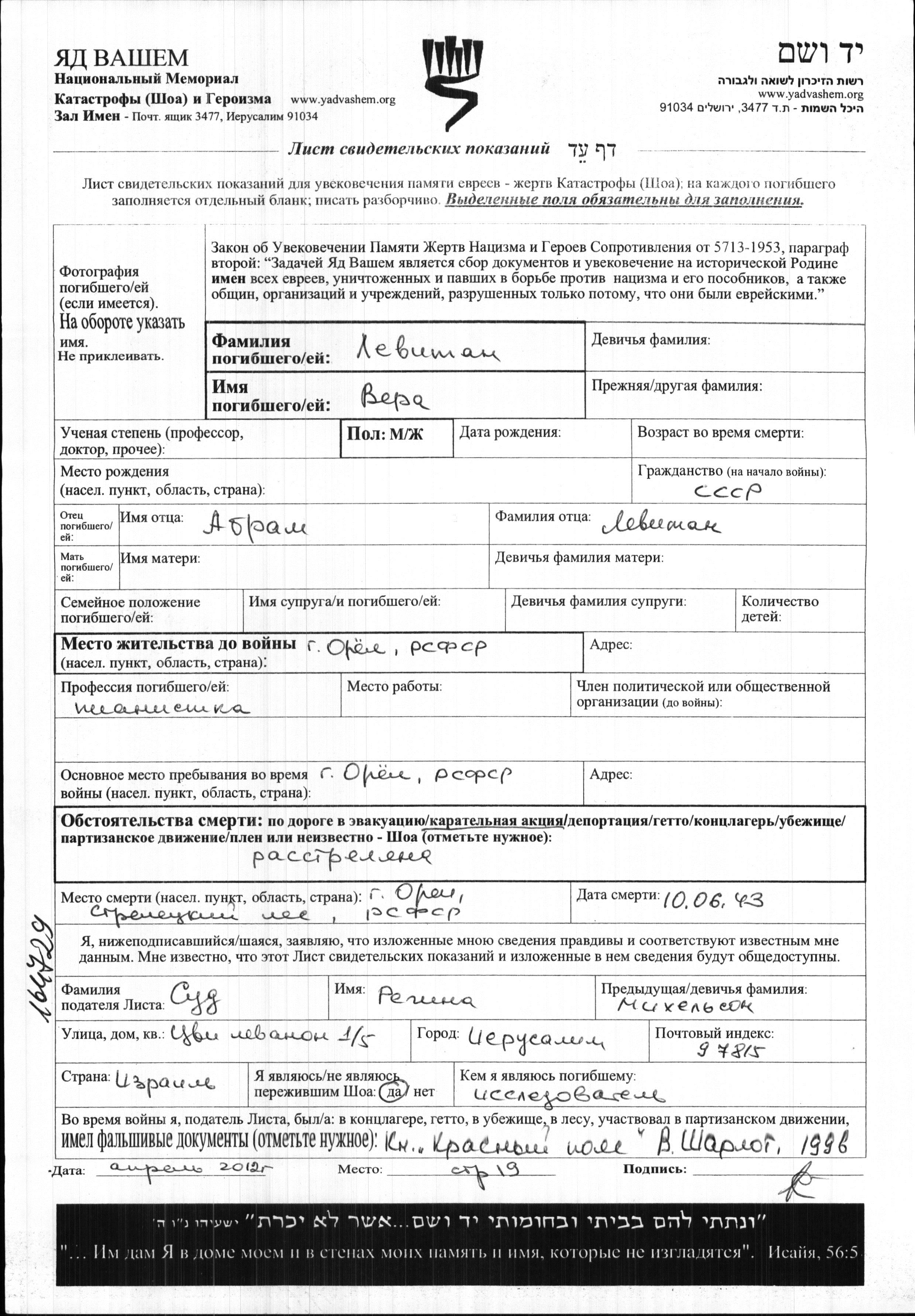 Levitan Vera Orel, Russia (USSR) Page of Testimony
