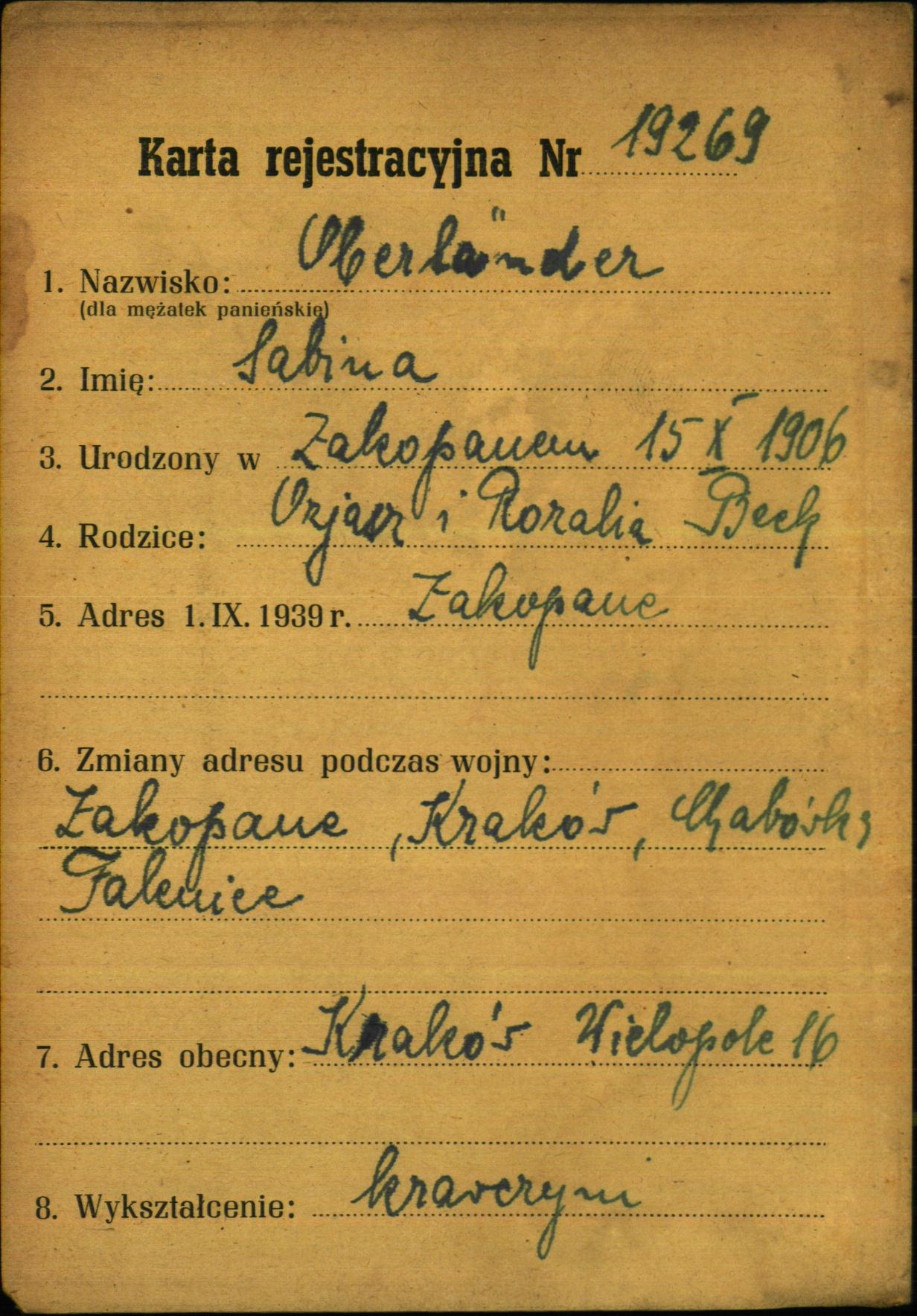 Sabina Oberlander was born in Zakopane, Poland, 1906 to Ozjasz and Rozalia. She was a krawczyni and single. Prior to WWII she lived in Zakopane, Poland. During the war she was in Chabowka, Poland. Sabina survived the Shoah.