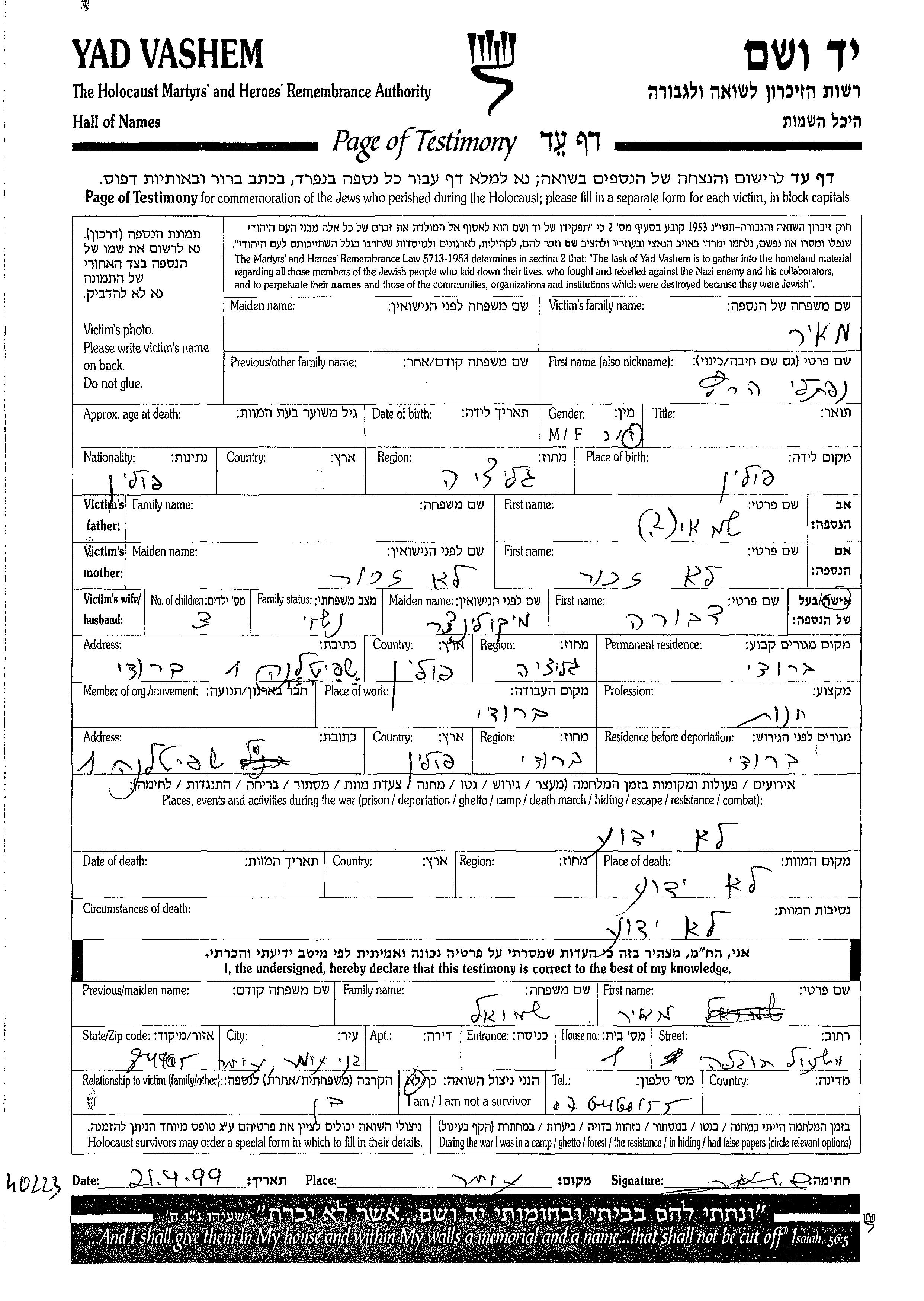 Naftali Hertz Meier was born in Galicia Region, Poland to Shamai. He was married to Dvora nee Mikulintzer. Prior to WWII he lived in Brody, Poland. During the war he was in Brody, Poland. Naftali Hertz was murdered in the Shoah.