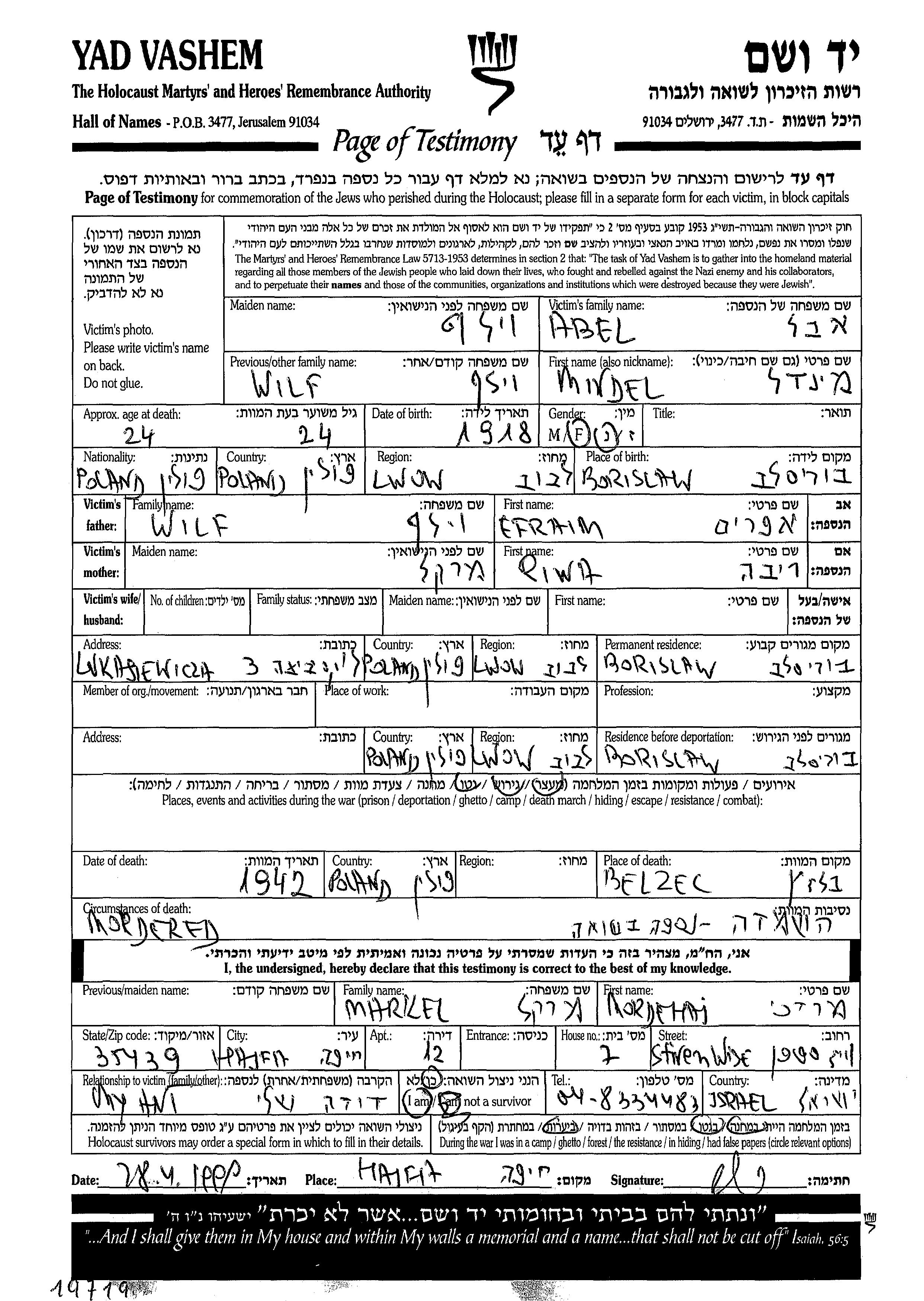 Yad Vashem - Pages of Testimony Names Memorial Collection