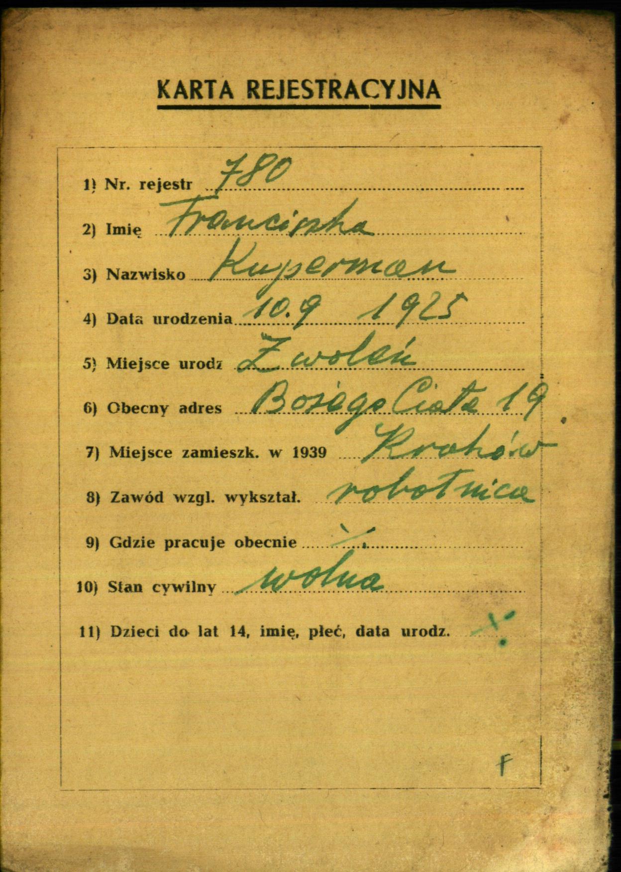 Franciszka Kuperman was born in Zwolen, Poland, 1925. She was a worker and single. Prior to WWII she lived in Krakow, Poland.