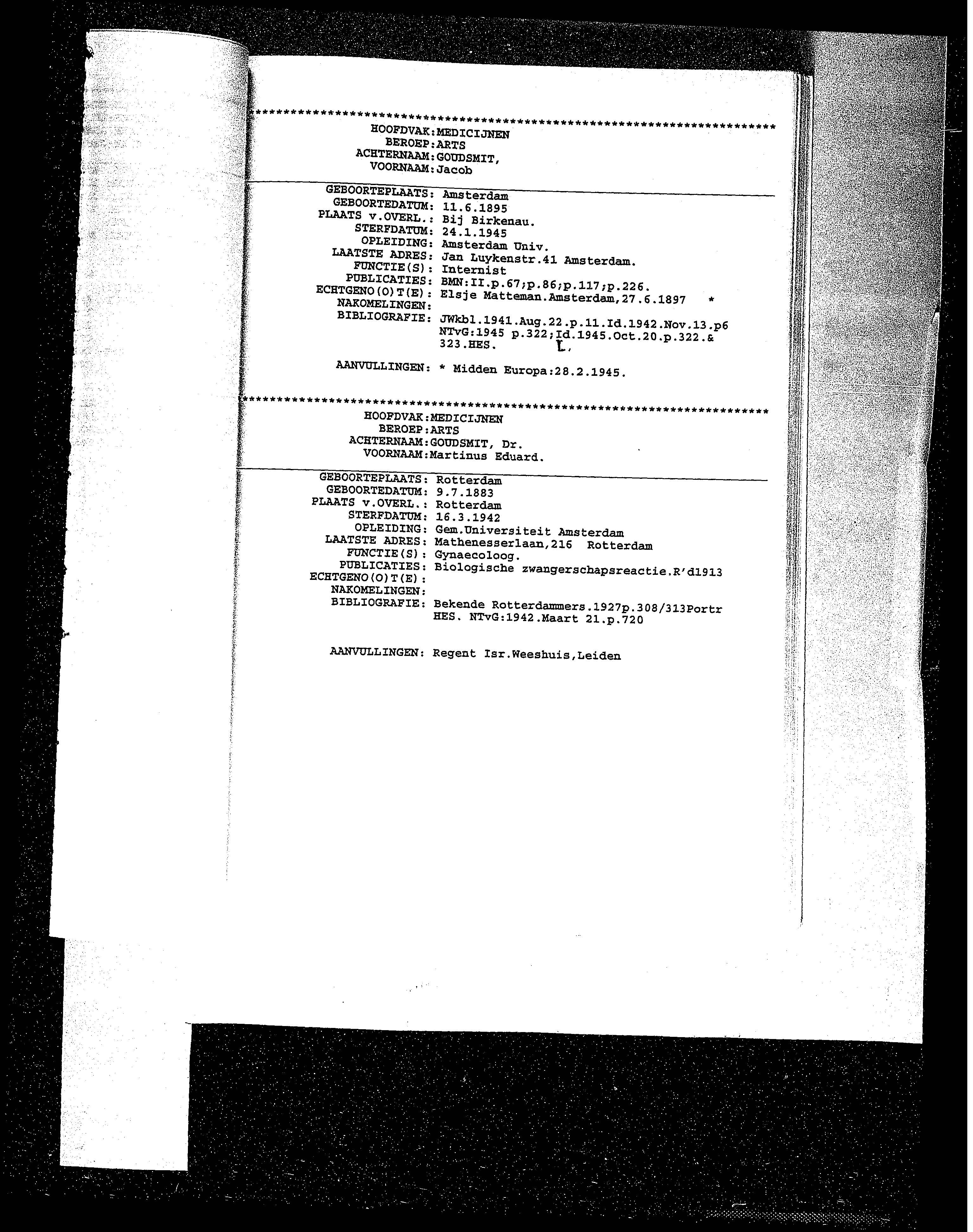 Jacob Goudsmit was born in Amsterdam, The Netherlands, 1895. He was a physician and married to Elsje nee Matteman. Prior to WWII he lived in Amsterdam, The Netherlands. Jacob was murdered in the Shoah. Place of death: Birkenau, Poland, 24/01/1945.