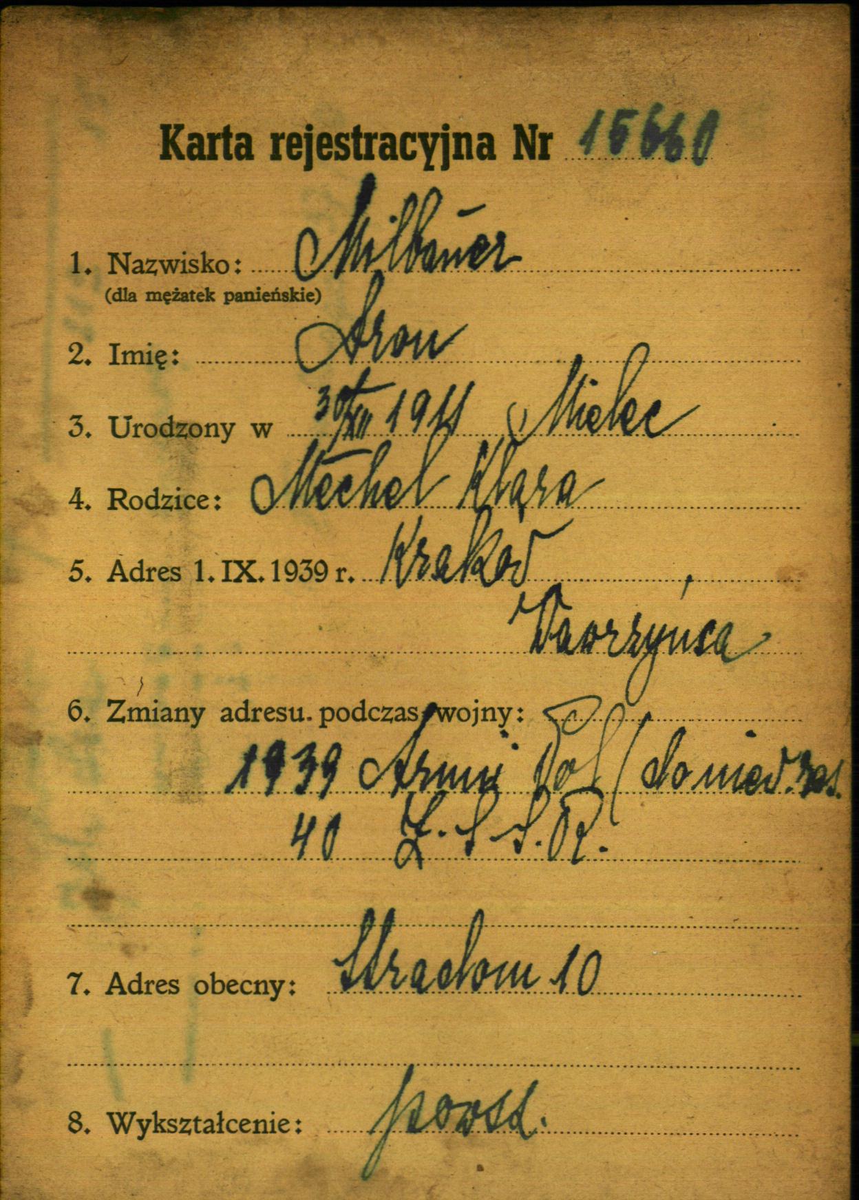 Aron Milbauer was born in Mielec, Poland, 1911. He was a baker. Prior to WWII he lived in Krakow, Poland. During the war he was in Soviet Union.