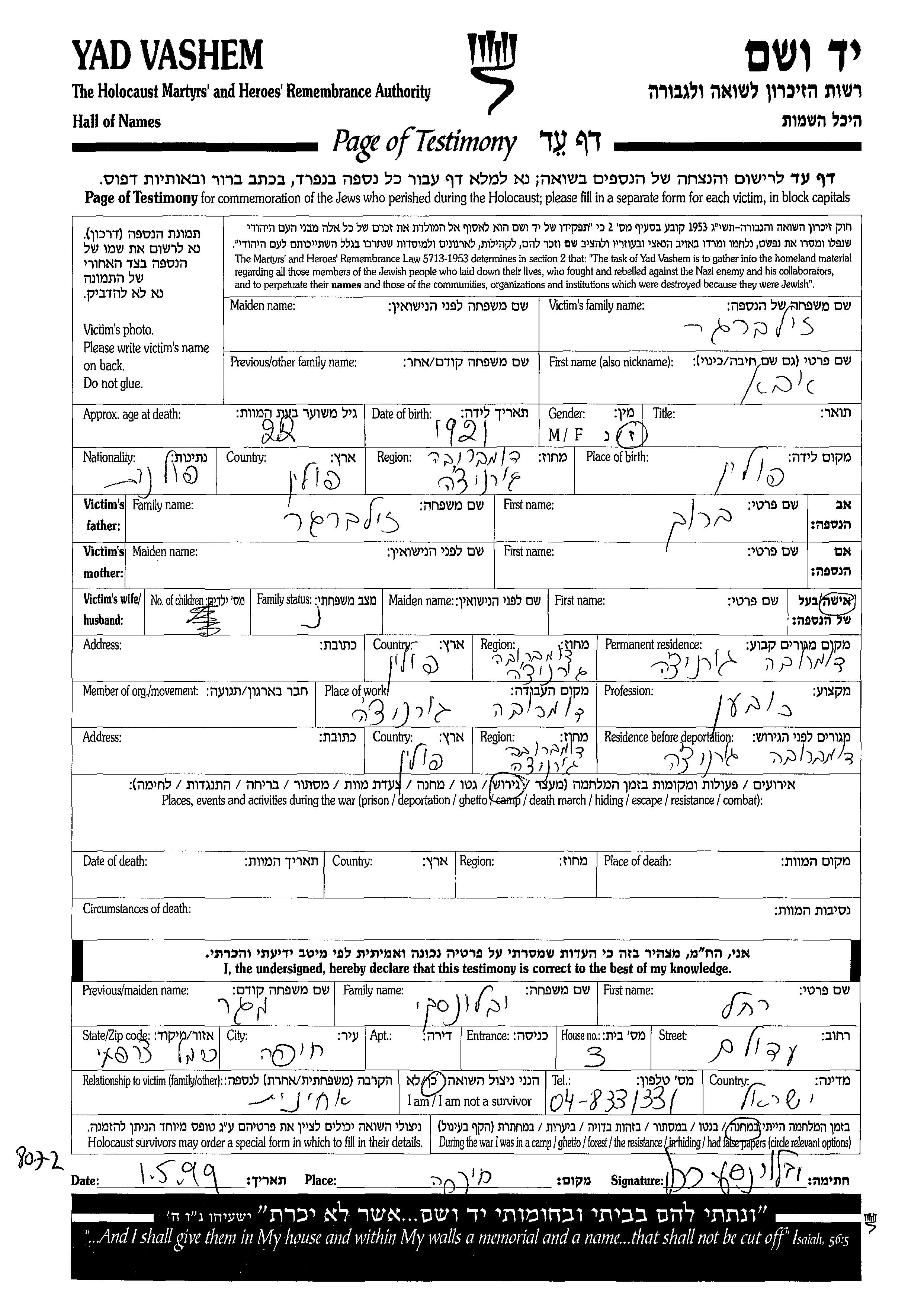 Aba Zilberger was born in Dabrowa Gornicza, Poland, 1921 to Barukh. He was a hatter and married. Prior to WWII he lived in Dabrowa Gornicza, Poland. During the war he was in Dabrowa Gornicza, Poland. Aba was murdered in the Shoah.