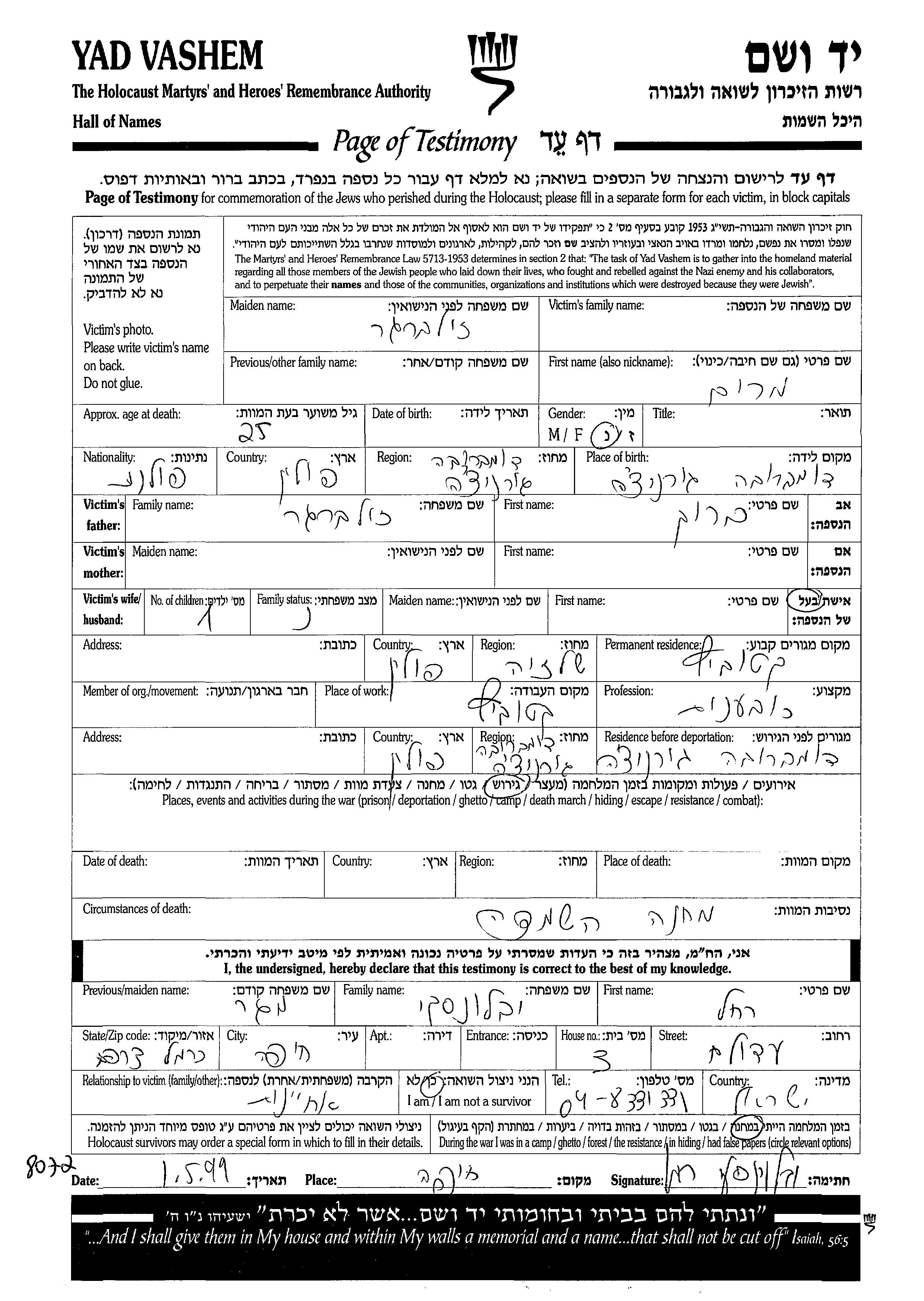 Miriam Zilberger was born in Dabrowa Gornicza, Poland to Barukh. She was a hatter and married. Prior to WWII she lived in Katowice, Poland. During the war she was in Dabrowa Gornicza, Poland. Miriam was murdered in the Shoah.