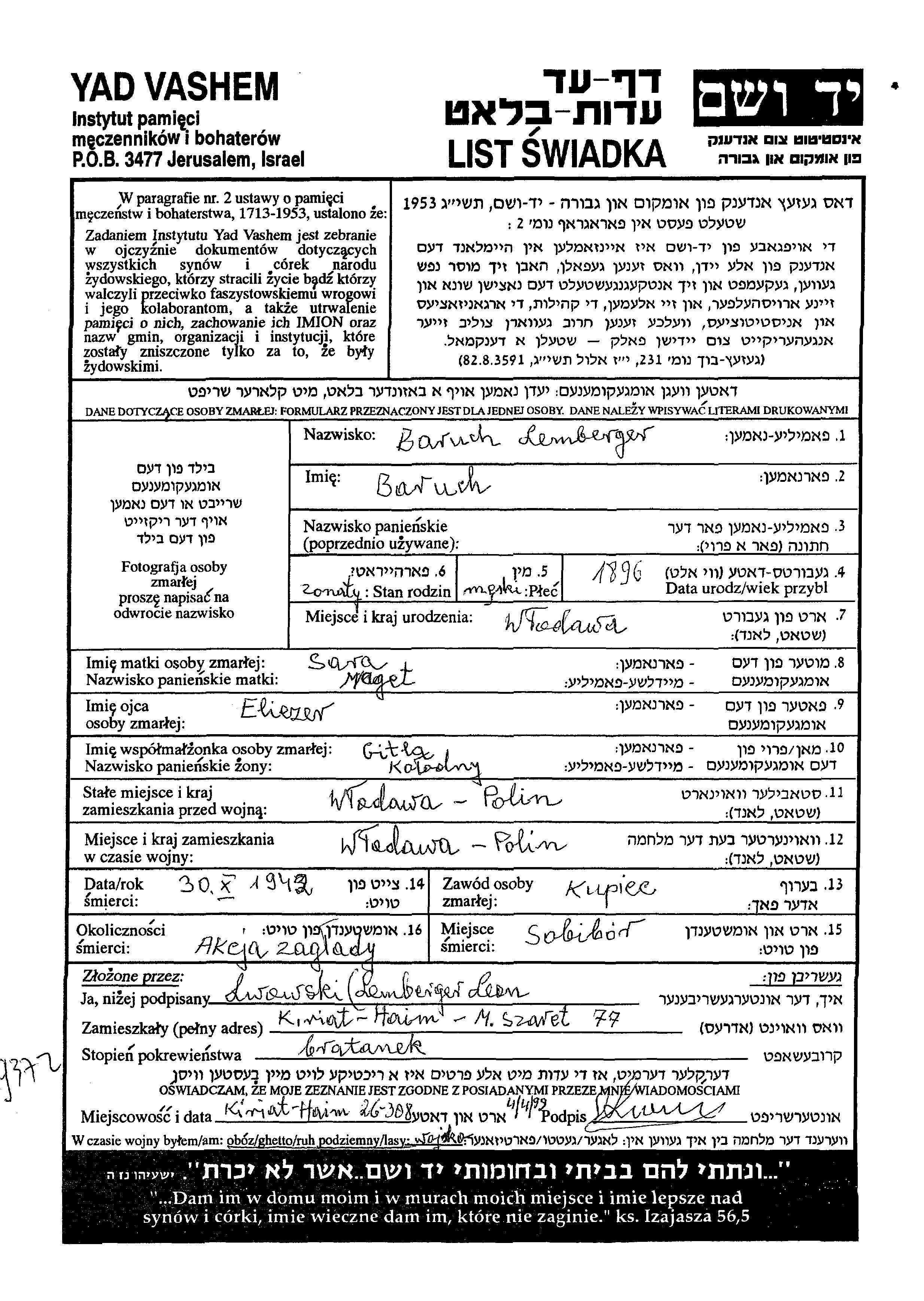 Baruch Lemberger was born in Wlodawa, Poland, 1896 to Eliezer and Sara. He was a sales person and married to Gitla nee Kolodny. Prior to WWII he lived in Wlodawa, Poland. During the war he was in Wlodawa, Poland. Baruch was murdered in the Shoah. Place of death: Sobibor, Poland, 30/10/1942.