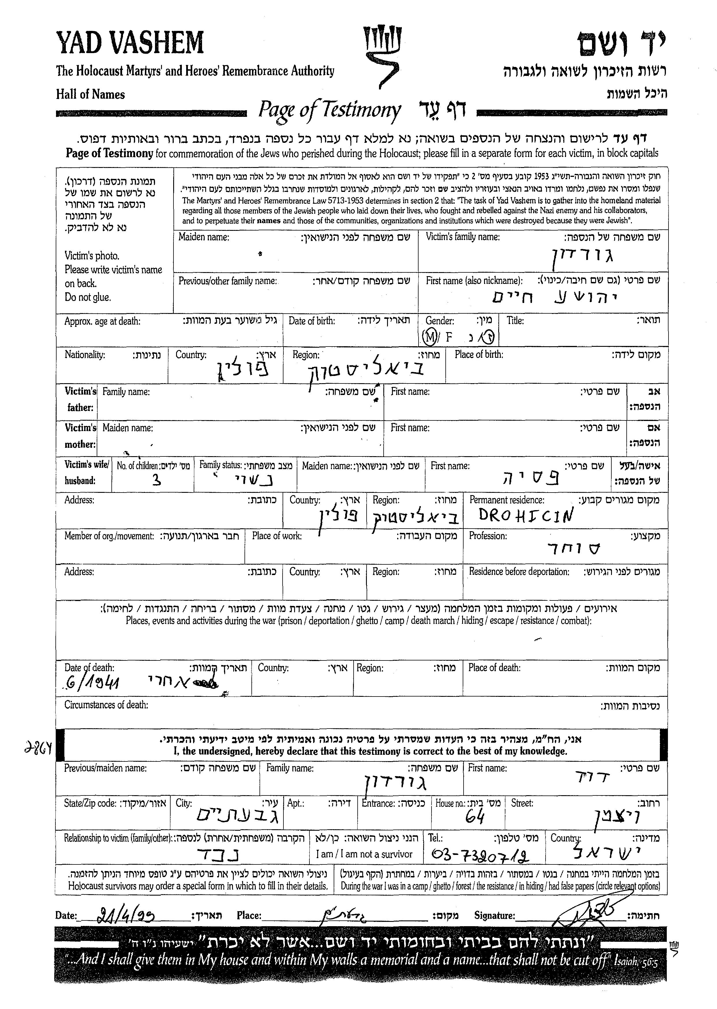 Gordon Yehoshua Khaim Drohichin, Poland Page of Testimony