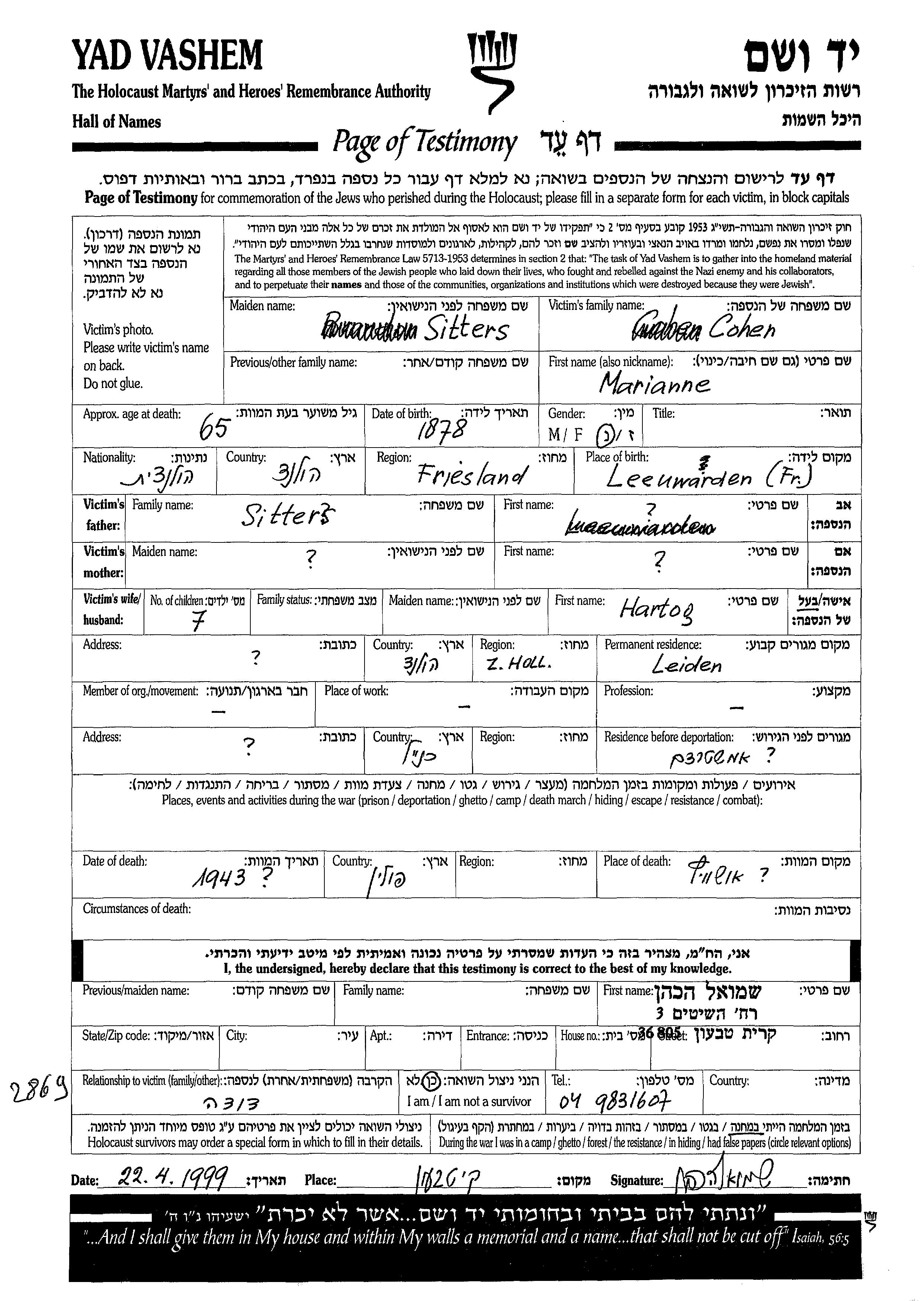 Cohen Marianne 1878 Leiden, The Netherlands Page of Testimony
