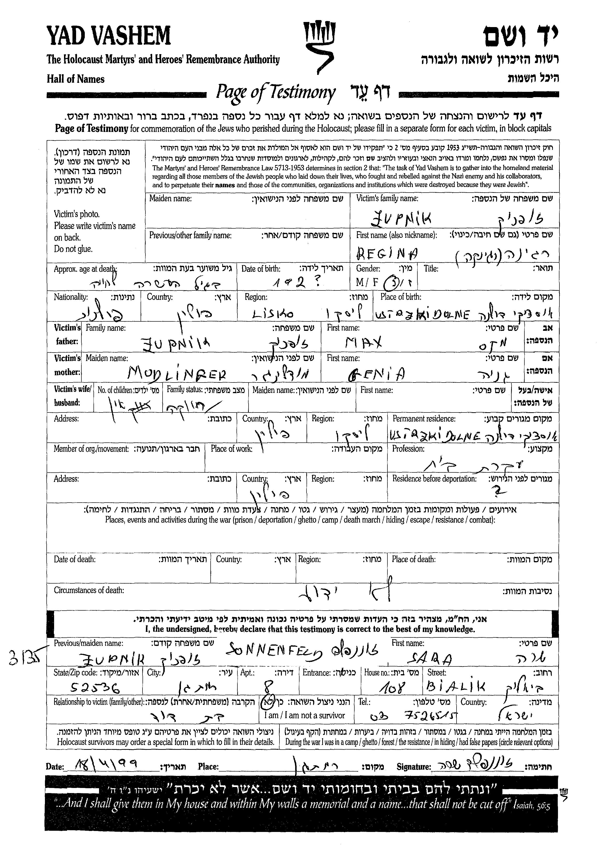 Regina Zupnik was born in Ustrzyki Dolne, Poland to Max and Genia. She was a housewife and single. Prior to WWII she lived in Ustrzyki Dolne, Poland. During the war she was in Poland. Regina was murdered in the Shoah.