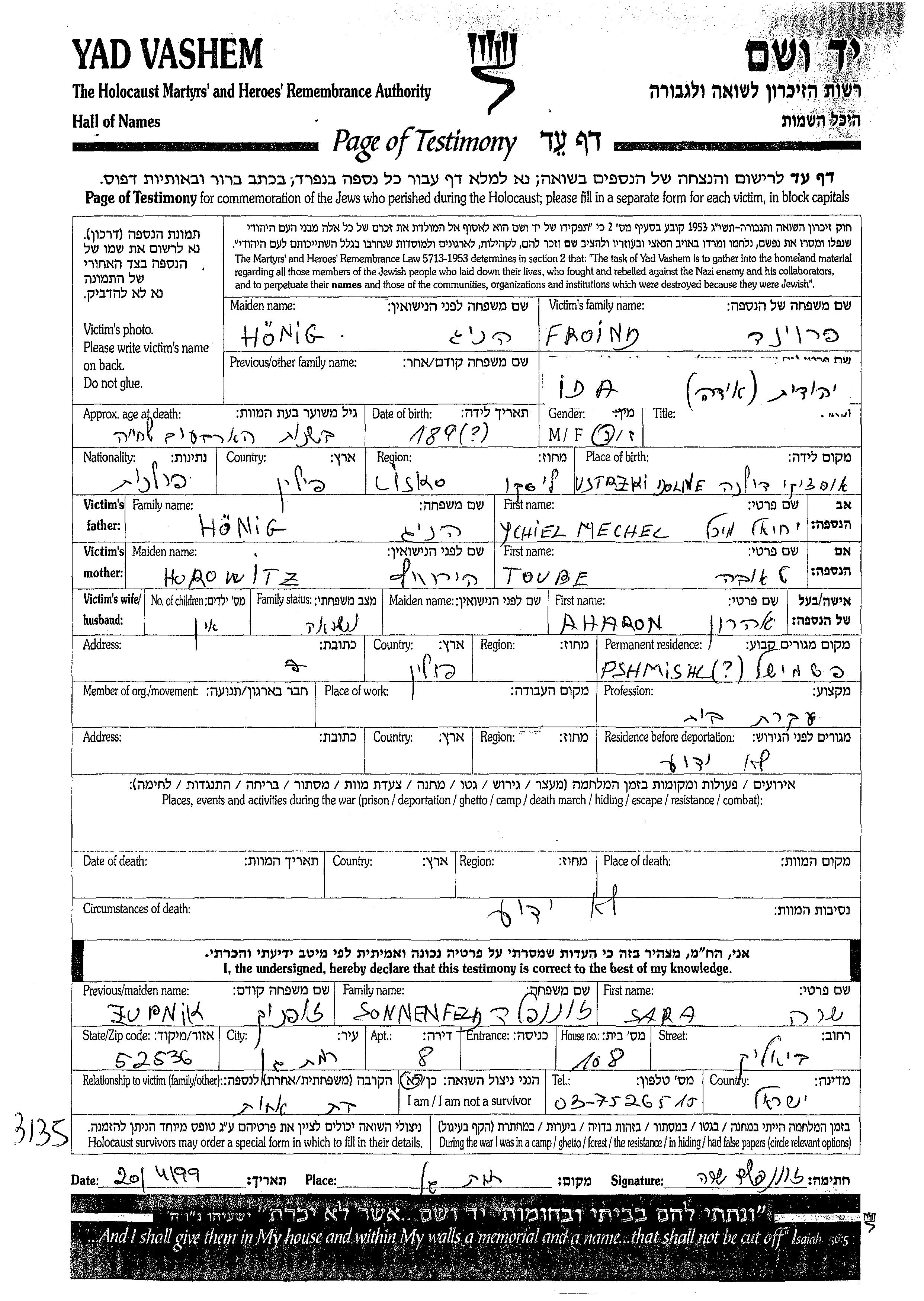 Ida Yehudit Froind nee Honig was born in Ustrzyki Dolne, Poland, 1891 to Ychiel Mechel and Toube. She was a housewife and married to Aharon. Prior to WWII she lived in Przemysl, Poland. Ida Yehudit was murdered in the Shoah.