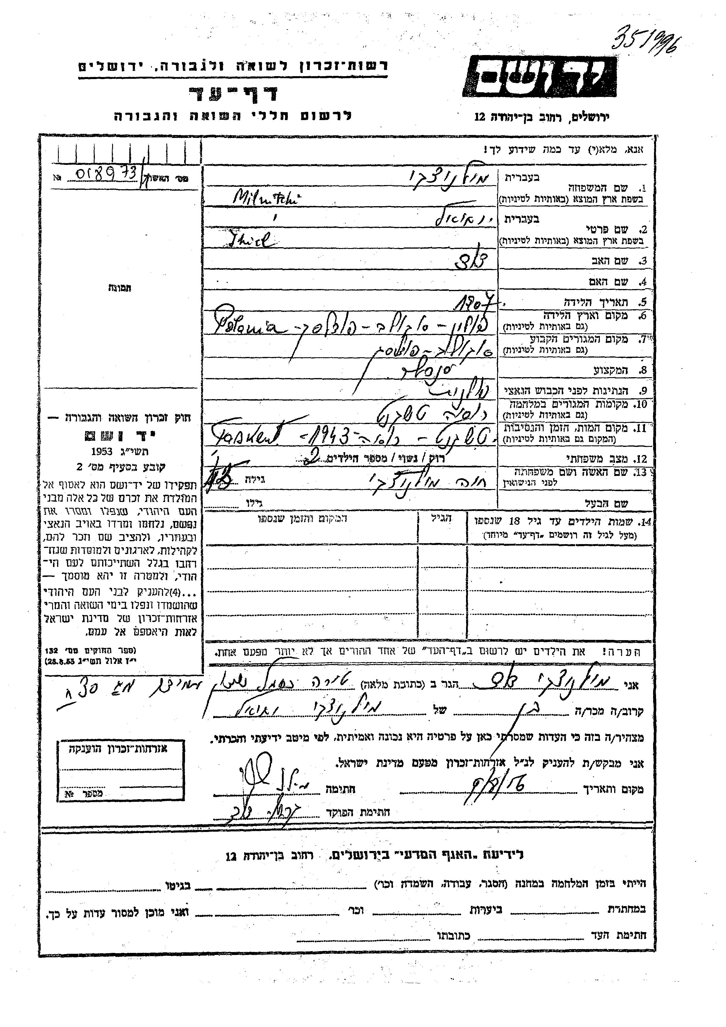 Yekhiel Mielnicki was born in Sokolow Podlaski, Poland, 1907. He was a shoemaker. Prior to WWII he lived in Sokolow Podlaski, Poland. Yekhiel perished during the period 1933-1945 in indirect relation with the Shoah.