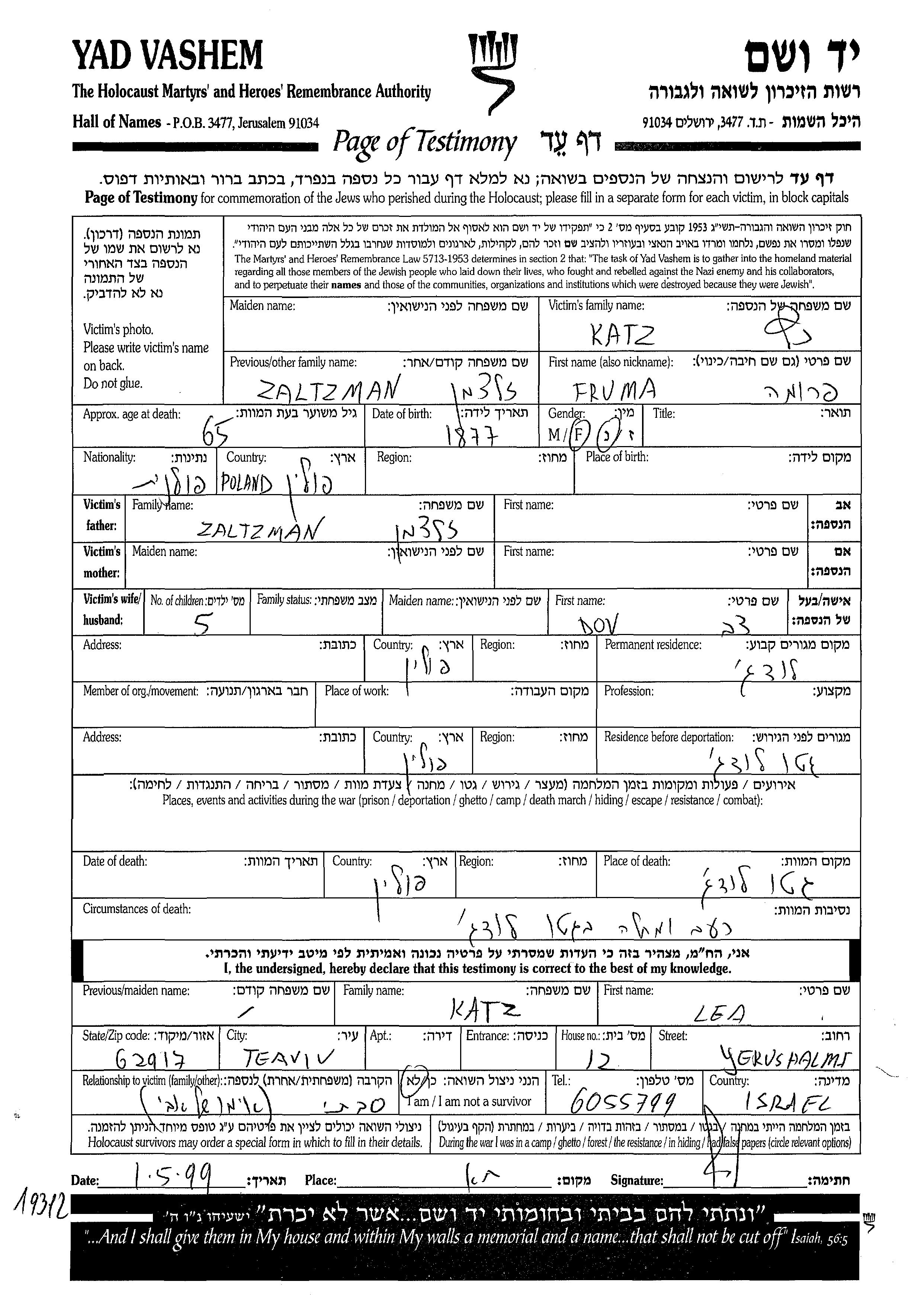 Katz Zaltzman Fruma 1877 Lodz, Poland Page of Testimony
