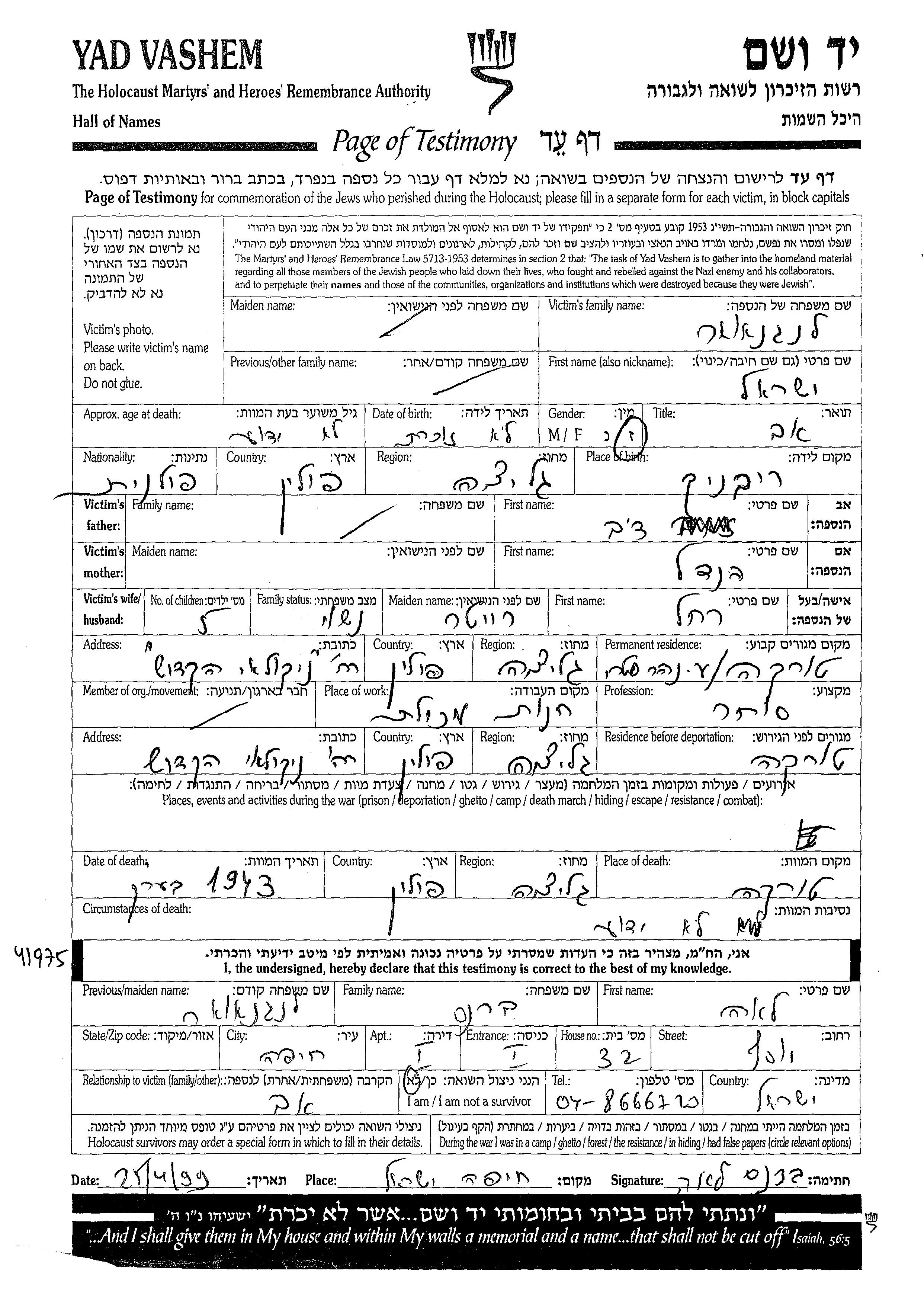 Yisrael Langenauer was born in Rybnik, Poland to Dov and Hendel. He was a merchant and married to Rakhel nee Reiter. Prior to WWII he lived in Turka, Poland. During the war he was in Turka, Poland. Yisrael was murdered in the Shoah. Place of death: Turka, Poland, 1943.