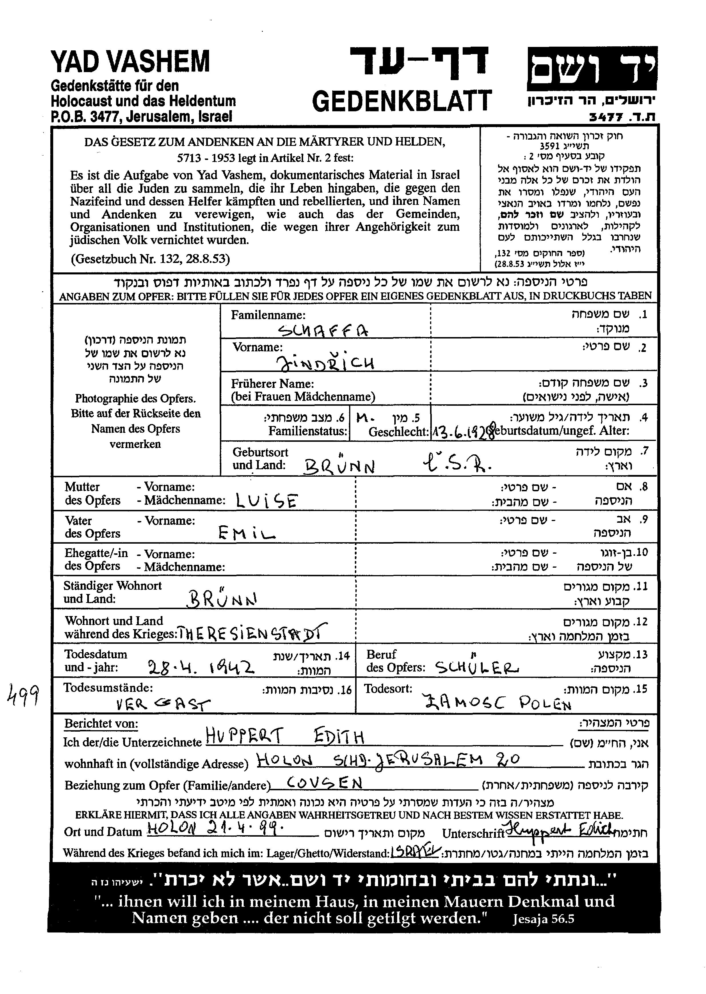 Schaffa Jindřich 1928 Brunn, Czechoslovakia Page of Testimony