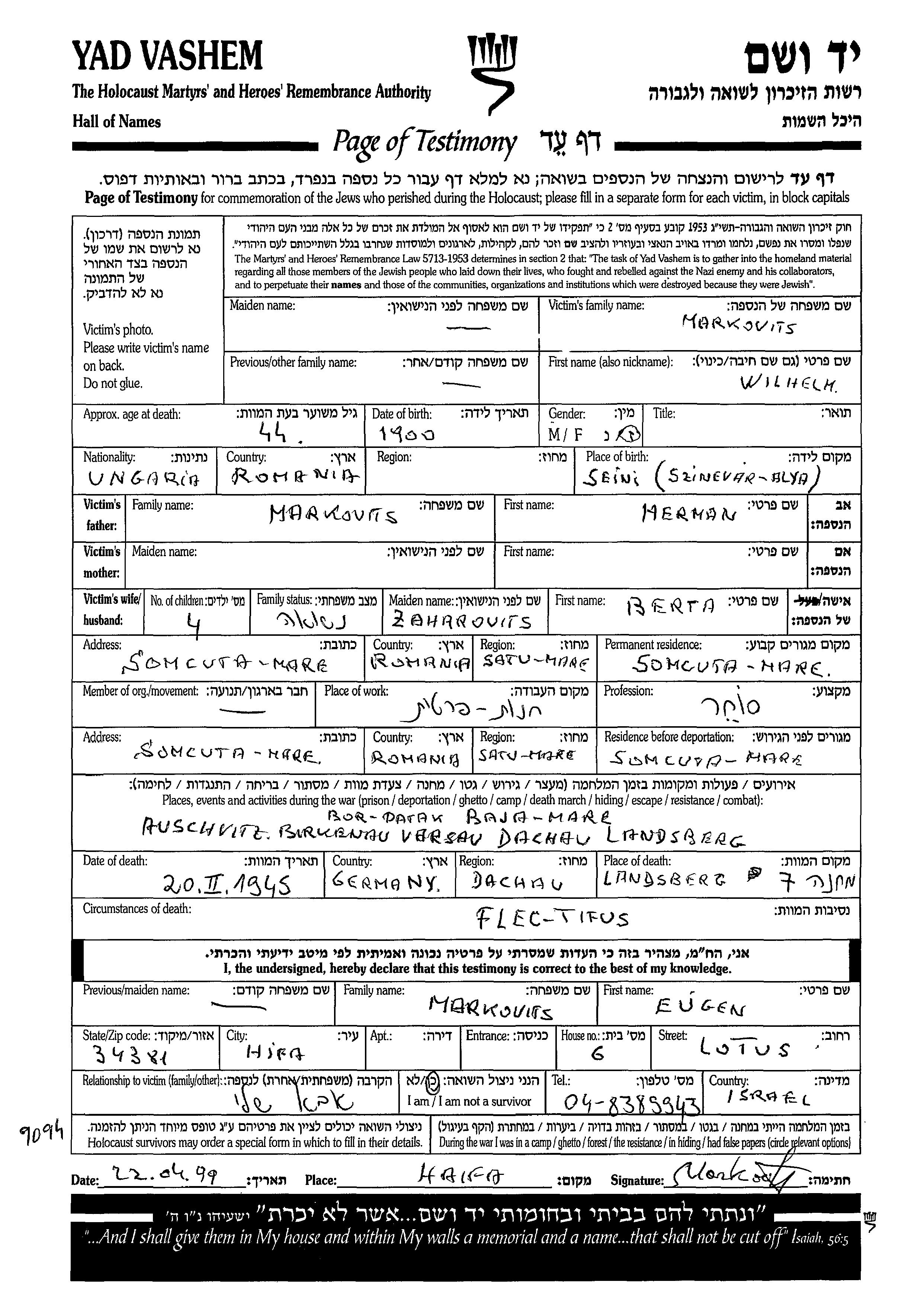 Wilhelm Markovits was born in Seini, Romania, 1900 to Herman. He was a merchant and married to Berta nee Zaharovits. Prior to WWII he lived in Somcuta Mare, Romania. During the war he was in Somcuta Mare, Romania. Wilhelm was murdered in the Shoah. Place of death: Landsberg, Germany, 20/02/1945.