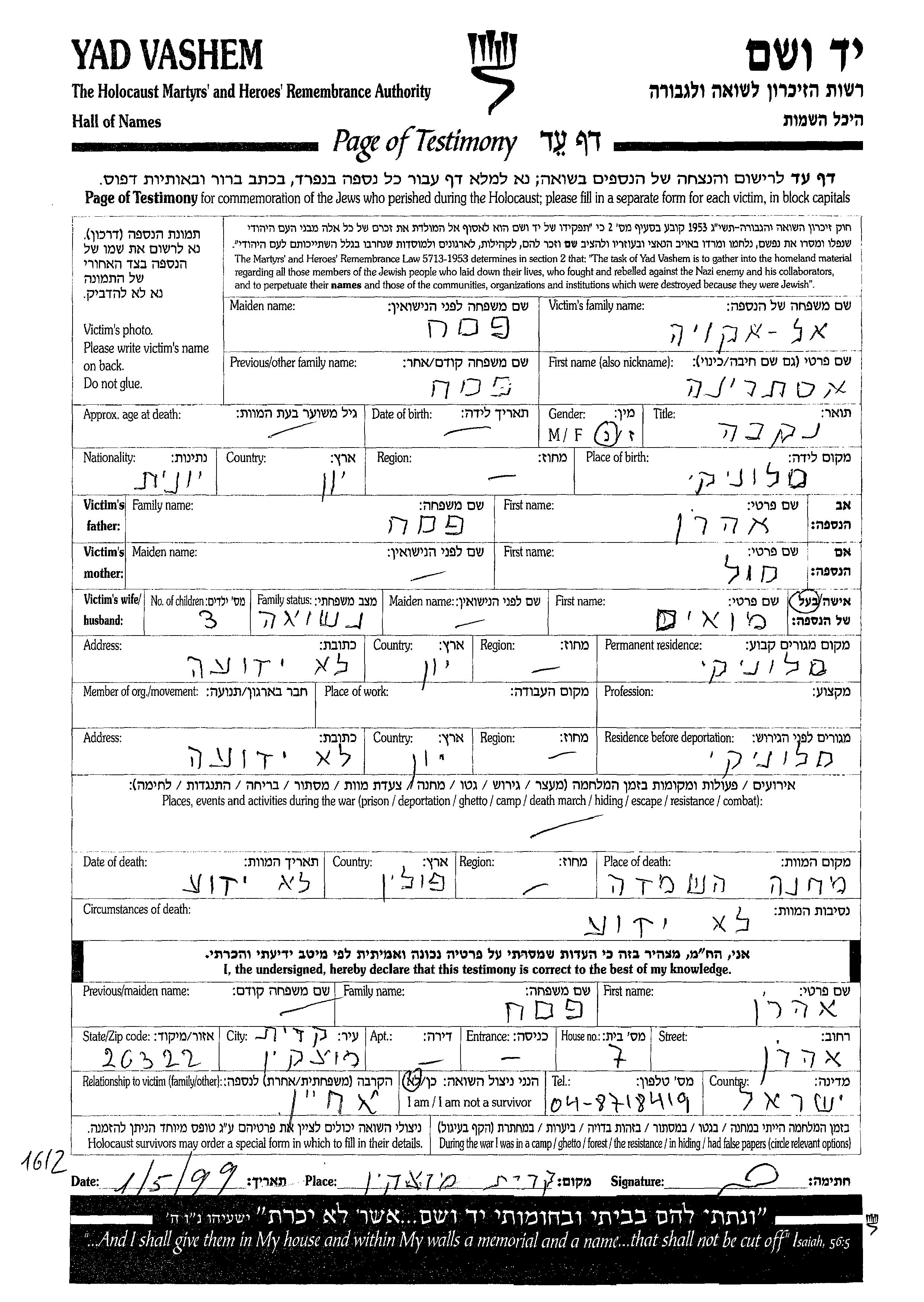 Esterina Al Akoya nee Pesakh was born in Saloniki, Greece to Aharon and Sol. She was married to Mois. Prior to WWII she lived in Saloniki, Greece. During the war she was in Saloniki, Greece. Esterina was murdered in the Shoah. Place of death: Camp, Poland.