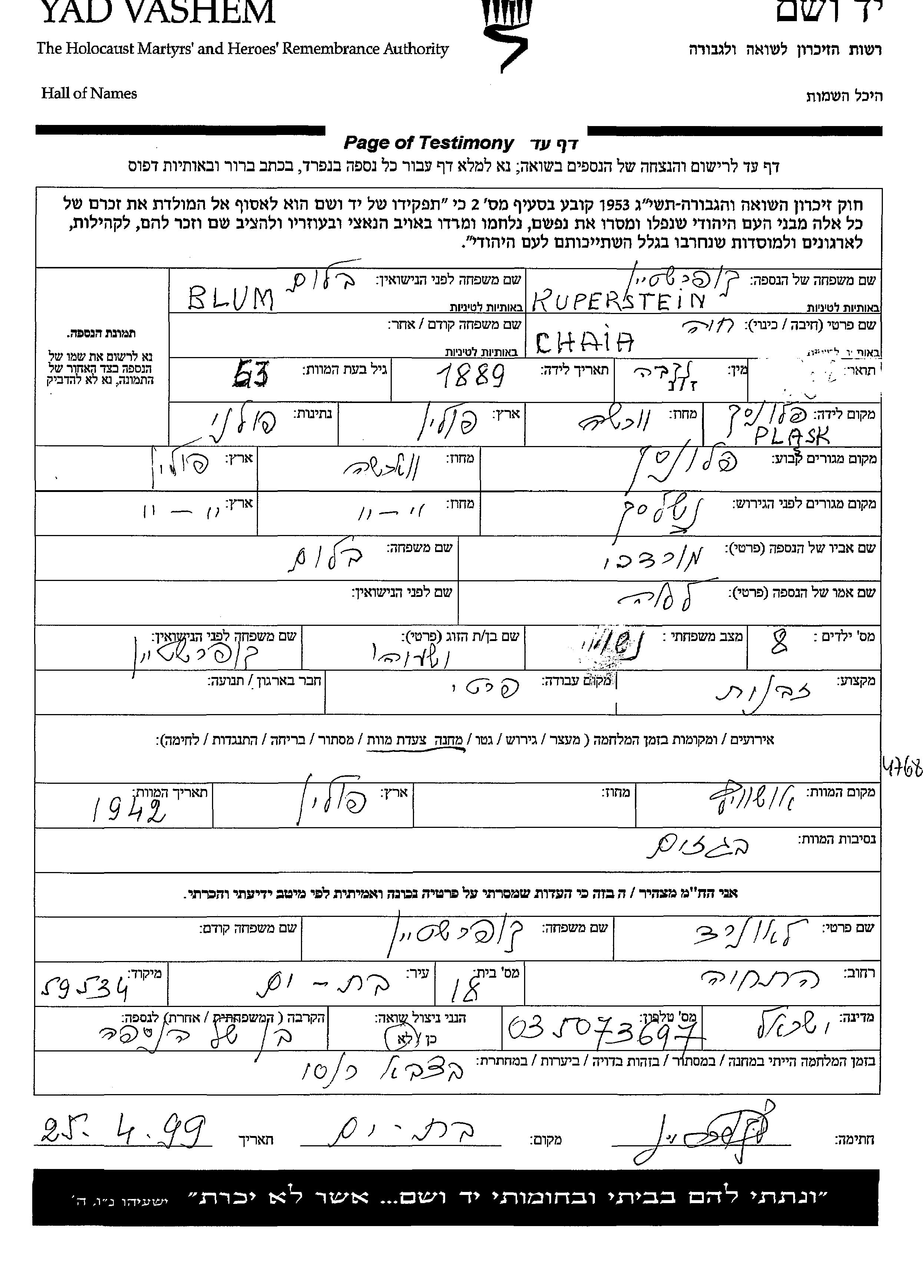 Chaia Kuperstein nee Blum was born in Plonsk, Poland, 1889 to Mordechai and Lea. She was a sales person and married to Yeshayahu. Prior to WWII she lived in Plonsk, Poland. During the war she was in Nasielsk, Poland. Chaia was murdered in the Shoah. Place of death: Auschwitz, Poland, 1942.