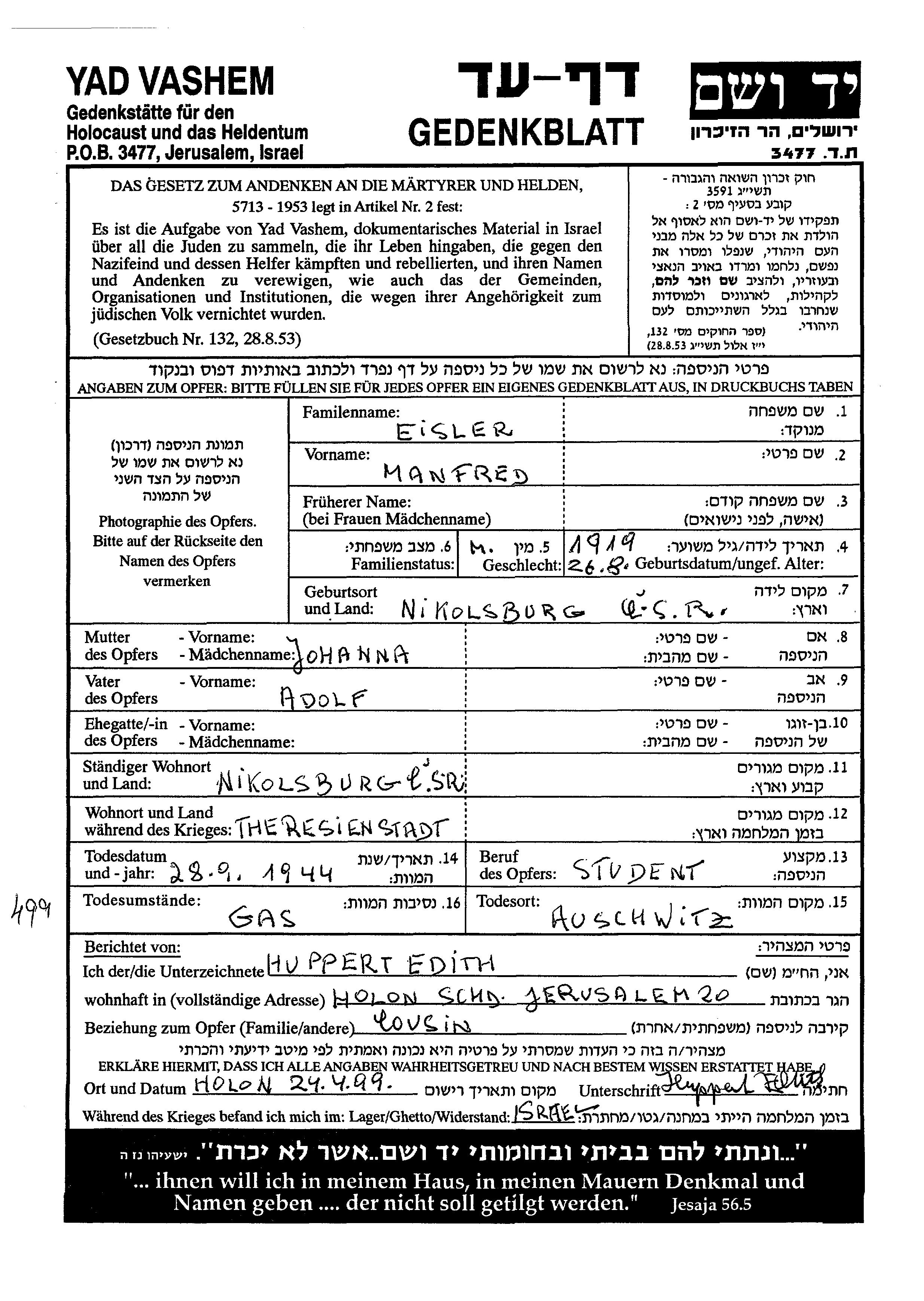 Eisler Manfred 1919 Nikolsburg, Czechoslovakia Page of Testimony
