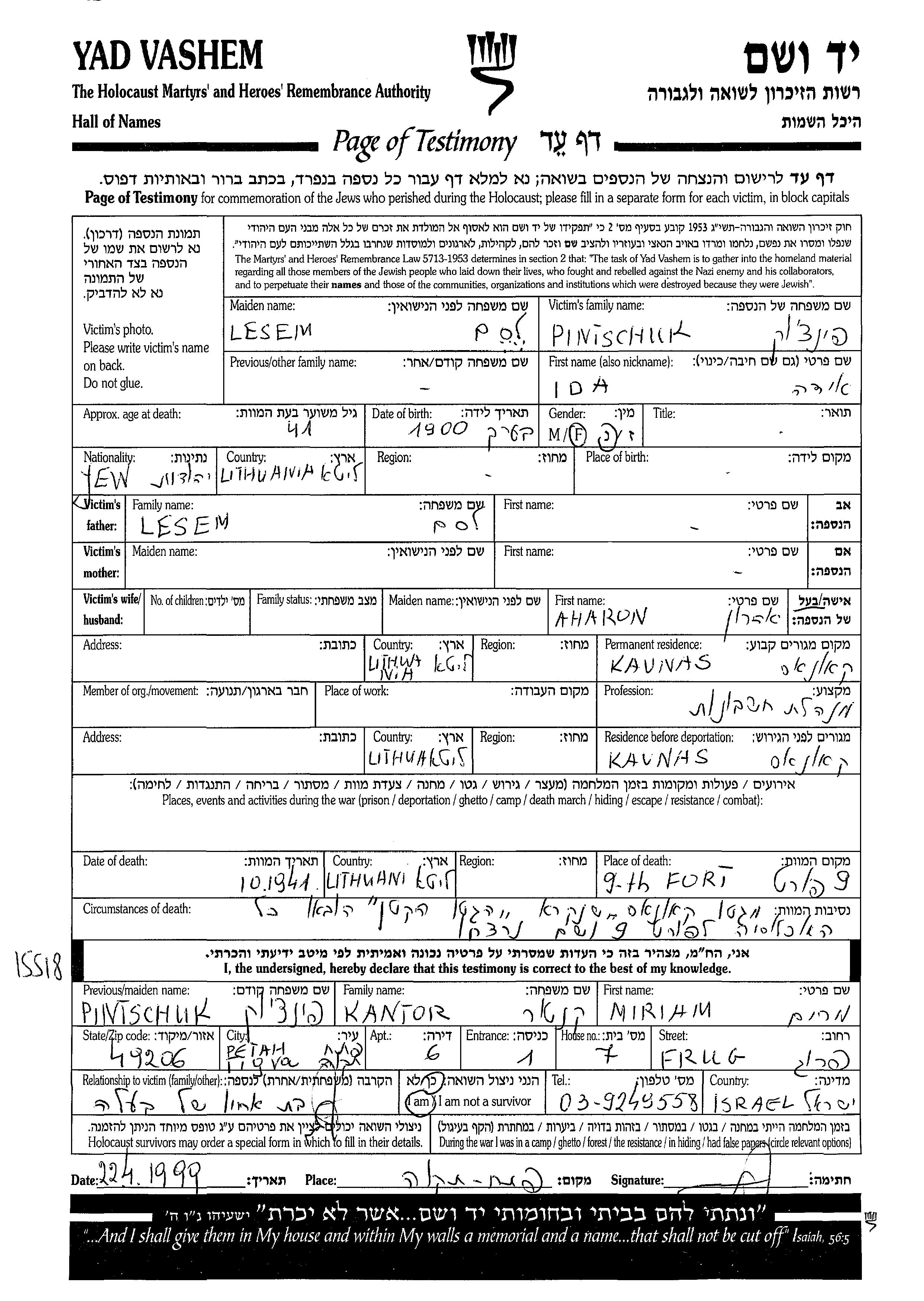 Pinischuk Ida 1900 Kaunas, Lithuania Page of Testimony