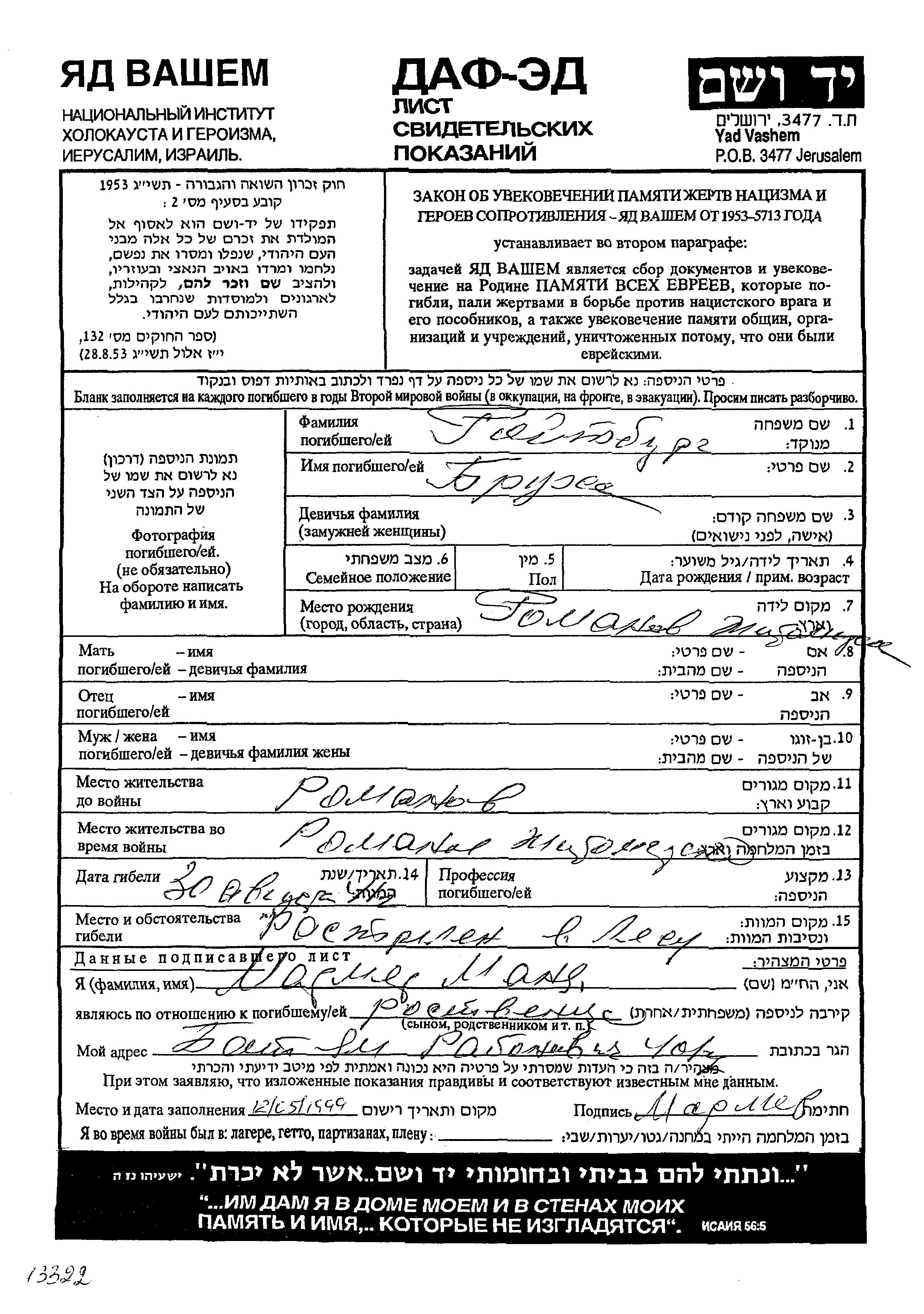 Brukha Roitburg was born in Romanov, Ukraine (USSR). Prior to WWII she lived in Romanov, Ukraine (USSR). During the war she was in Romanov, Ukraine (USSR). Brukha was murdered in the Shoah. Place of death: unknown, 30/08/1941.