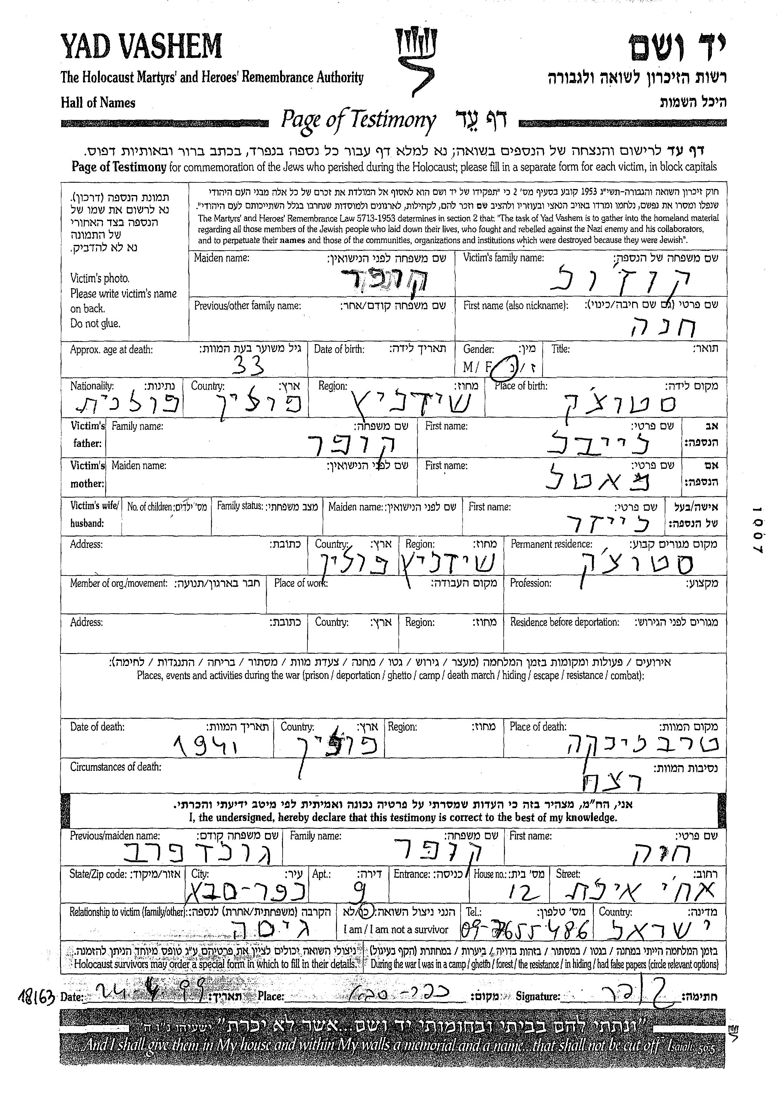 Khana Kozol nee Kuper was born in Stoczek, Poland to Leibel and Matl. She was married to Leizer. Prior to WWII she lived in Stoczek, Poland. Khana was murdered in the Shoah. Place of death: Treblinka, Poland, 1941.