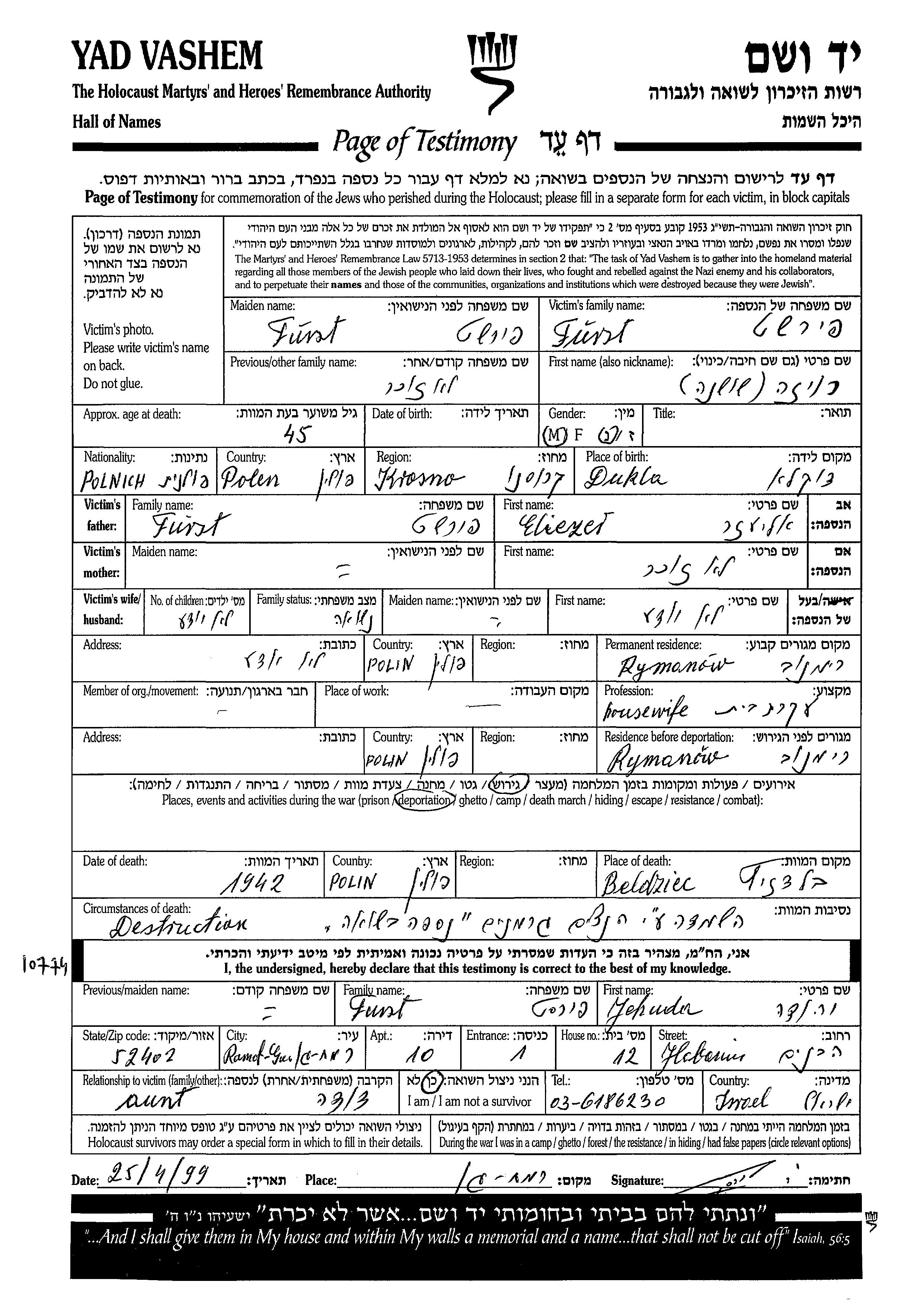 Roiza Shoshana Fuerst was born in Dukla, Poland to Eliezer. She was a housewife and married. Prior to WWII she lived in Rymanow, Poland. During the war she was in Rymanow, Poland. Roiza Shoshana was murdered in the Shoah. Place of death: Belzec, Poland, 1942.