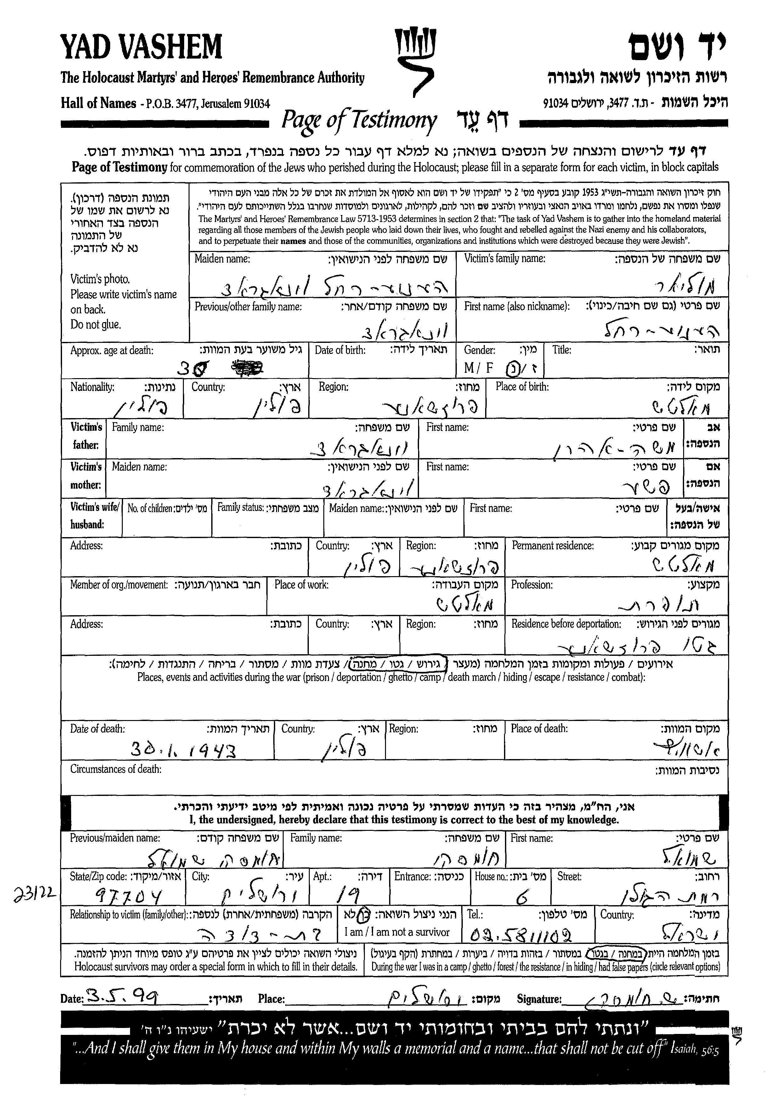 Khene Rakhel Muliar nee Vinograd was born in Malecz, Poland to Moshe Aharon and Peshe. She was a seamstress. Prior to WWII she lived in Malecz, Poland. During the war she was in Pruzana, Poland. Khene Rakhel was murdered in the Shoah. Place of death: Auschwitz, Poland, 30/01/1943.