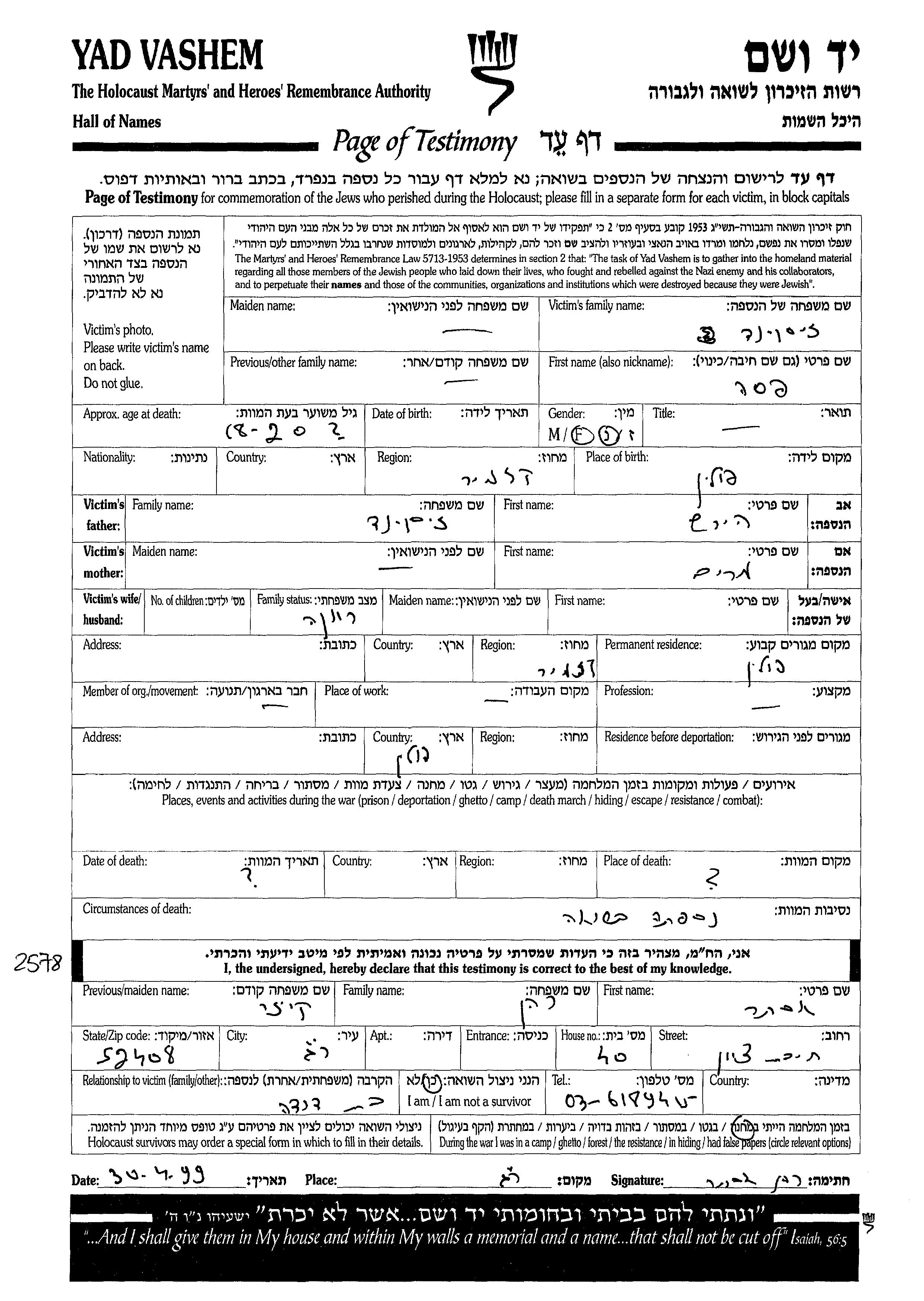 Pesa Ziskind was born in Kazimierz Dolny, Poland to Hirsh and Miriam. She was single. Prior to WWII she lived in Kazimierz Dolny, Poland. During the war she was in Poland. Pesa was murdered in the Shoah.